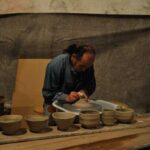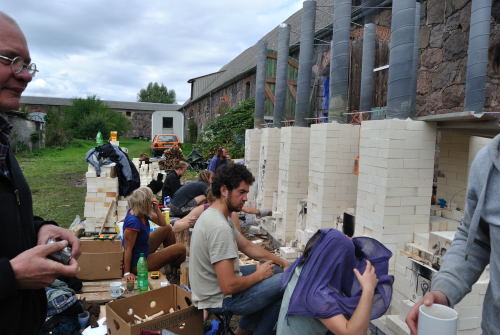 Otro de los platos fuertes de esta reunión fue la construcción y cocción de diez pequeños hornos “anagama”. Estos hornos se cocieron, cada uno de ellos, con un tipo de madera diferente, de modo que se pudiera ver la diferencia del esmalte natural procedente de las distintas cenizas. Fue realmente estimulante ver a decenas de estudiantes pasando días enteros cortando leña, construyendo y cargando los hornos, cociéndolos durante toda la noche, durmiendo en tiendas de campaña y trabajando además en las tareas de limpieza o cocina. Tuvieron su recompensa porque, además de pasarlo en grande, pudieron llevarse los materiales utilizados a precios realmente “de regalo”.