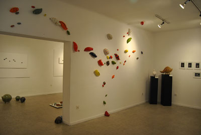 Esto viene por el carácter, a primera vista lúdico, de las instalaciones de Ana, en las que sus criaturas (entrañables y blanditas ¡a pesar de ser de cerámica!) suben por las paredes e invaden todos los espacios, llenando de color y optimismo hasta el último rincón de las salas. Ana parece crear un mundo paralelo para sus “bichos”, un poco como un juego; los fotografía, cazándolos en instantáneas mientras transitan por las calles o por la nieve; los enfrenta a personajes humanos, a pequeños muñecos que les aportan una escala, al modo de las maquetas que nos hacen ver como será una casa o un parque, en este caso nos señalan cómo sería el encuentro de una de estas babosas de cerámica al encontrarse frente a frente con una persona (lo cual aporta un componente que daría juego para un estudio metafísico más “serio” sobre la realidad de la naturaleza en su obra, pero eso lo dejaré para los críticos…). Ana ferichola nos dice: “(…) en mis últimas obras he incluido un elemento no cerámico, que son hombrecitos de plástico (los que se utilizan en las maquetas), que estarán tanto en las exposición en vivo como en las fotografías, y que permiten imaginar un mundo de proporciones cambiantes en las que el gigante es la criatura y no el espectador.”