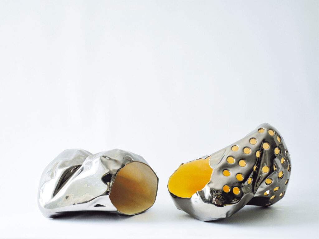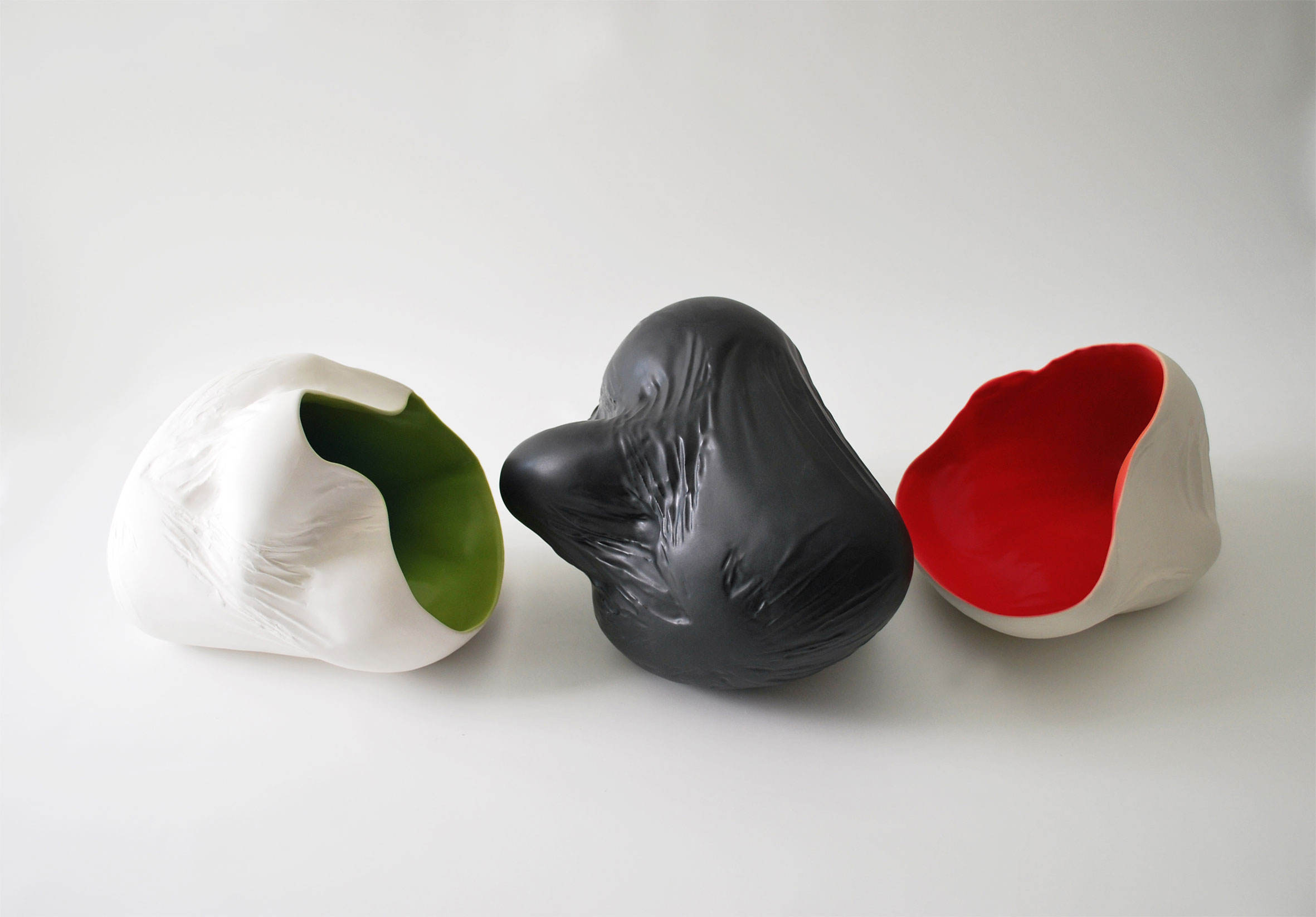 El aspecto táctil de los volúmenes –negro para evocar el universo de látex y cuero, metálico para escapar de nuestra expectativa de porcelana blanca y reforzar la artificialidad de la ficción, o mate, suave y brillante, para aumentar el deseo de tocar, acariciar, sentir la lascivia –, se suma a la dualidad de la percepción. En lo que a las aberturas y cortes se refiere, se turnan estableciendo una relación visual puramente plástica entre las caras interiores y exteriores de la forma o, atrayendo nuestra mirada con su inquieto parecido, se presentan a sí mismos como magulladuras reales o dilataciones rojas de sensualidad y erotismo.