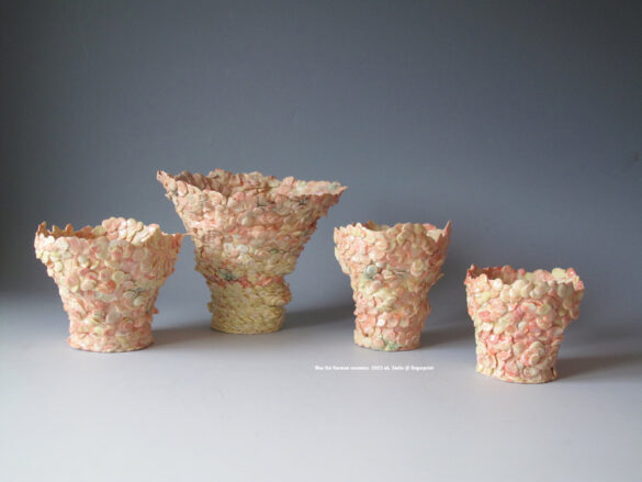 Este punto de inflexión, o de evolución, si se quiere, se desencadenó definitivamente durante su estancia en Japón, donde trabajó en el taller del prestigioso ceramista Rizu Takahashi, junto al que se introdujo en el mundo del esmalte shino. Ciertamente, viendo su trabajo en perspectiva, parece una evolución lógica, ya que los esmaltes de sales de sodio y el shino tienen mucho en común, al menos estéticamente.