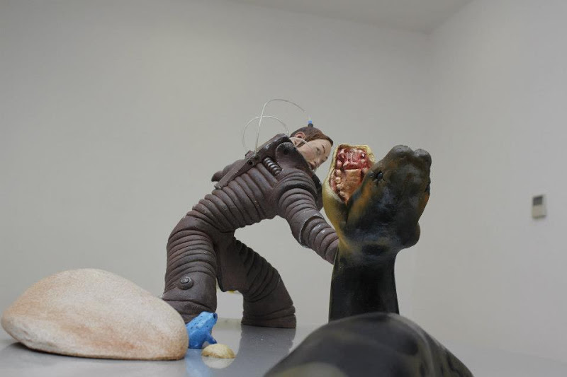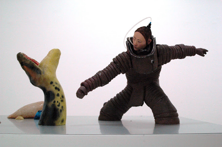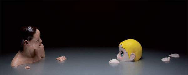 Javier Aguilera gusta de utilizar el cuerpo humano como vehículo expresivo en sus esculturas. Su fascinación por el anime le lleva a crear unas realidades compuestas por personajes particularmente sorprendentes, que evolucionan en los mismos escenarios que otros de apariencia humana. Hay un interesante componente narrativo en muchas de sus esculturas escenografiadas, que entroncan con el lenguaje cinematográfico y con la animación. También el videojuego, con su galaxia de freaks, juega un importante papel en la puesta en escena de Aguilera. “The anaconda whisperer”, por ejemplo, despliega a modo de diorama la lucha entre el héroe y el monstruo, en un paisaje acuático simulado mediante la fragmentación de las figuras, efecto visible asimismo en “Kawaguchi Lake”.