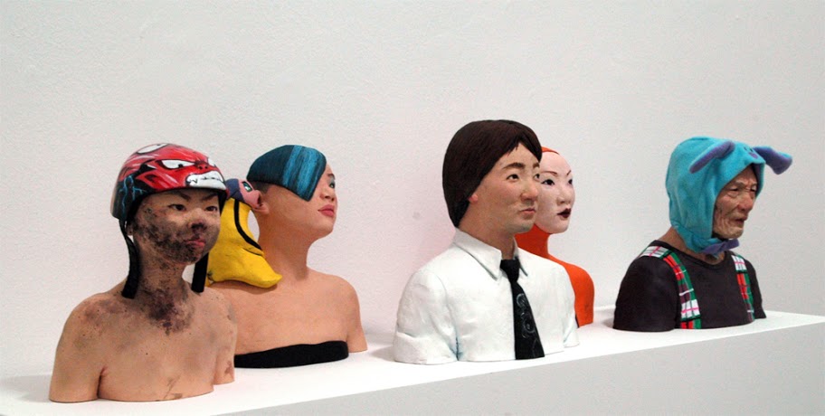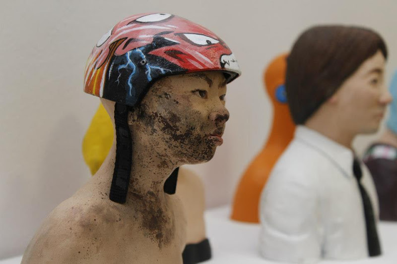 Estas esculturas de Javier Aguilera están realizadas den arcilla policromada, aunque utiliza otros materiales. Las medidas de las instalaciones son variables.