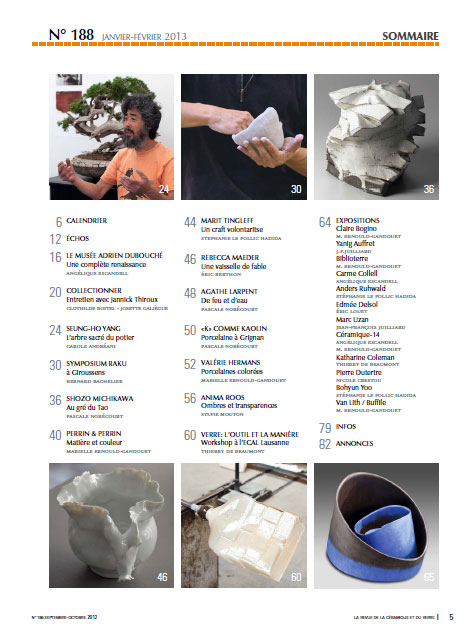 Los artistas son el coreano Seung-Ho Yang su terrea obra realizada en La Borne; el japonés Shozo Michikawa, un ceramista con una trayectoria ascendente en el panorama europeo; la pareja de artistas Perrin & Perrin, con sus esculturas de vidrio; Marit Tingleff, que desde escandinavia ofrece su obra escultórica, a caballo entre las dos y las tres dimensiones, sin olvidar nunca su tradición cerámica; la porcelana es la protagonista de la obra de la alemana Rebecca Maeder. La obra de Valérie Hermans y la de Anima Roos se comenta con la ocasión de sendas exposiciones. Aunque el propio repaso a las exposiciones permite a los lectores conocer las realizadas en los últimos meses, entre las que encontramos la de la catalana Carme Collell, en la Clara Scremi Gallery, de París.