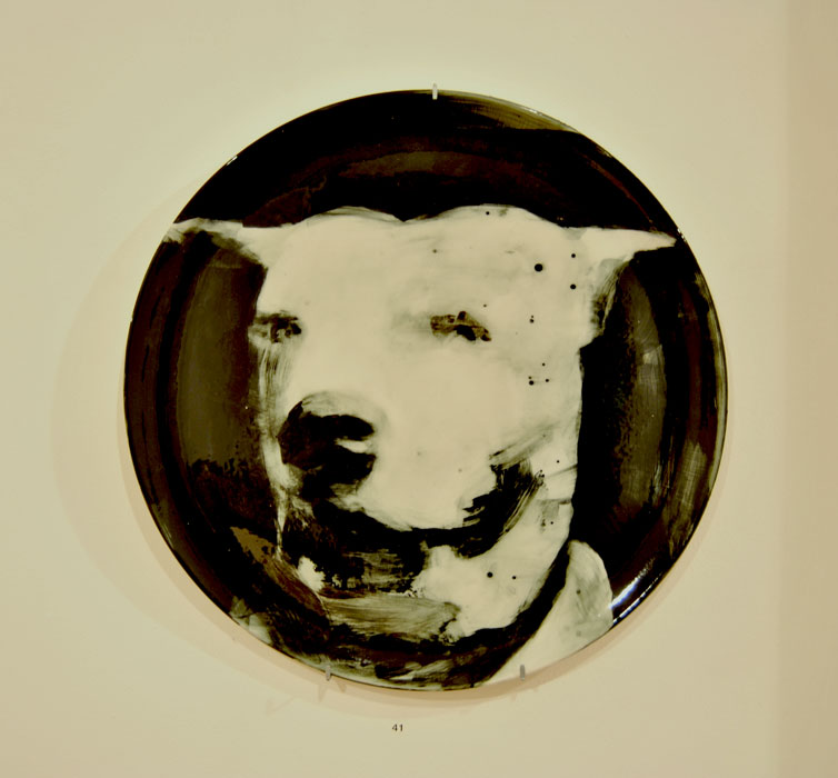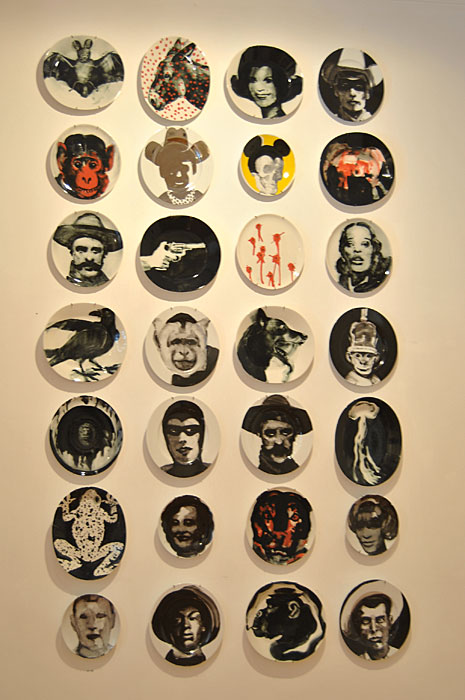 Por otro lado tenemos los platos, grandes platos (supongo que de porcelana) en los que pinta con absoluta libertad con un claro guiño al Arte Pop. Estos platos están agrupados en una sola pared, por lo que componen un mural ciertamente impresionante. Sin embargo, en el listado de la galería se presentan como piezas separadas, aunque algunos de estos platos probablemente no “funcionarían” demasiado bien separado de los otros. En otra pared encontramos otro gran plato con la imagen de la cabeza de un perro. Estos platos son en su mayoría monocromáticos y representan caras de cowboys, que parecen sacadas de viejas fotografías, cabezas de animales (chimpancés, perros, murciélagos, burros, ranas…), algunas imágenes icónicas de la cultura popular mundial, como Mickey Mouse o “El hombre enmascarado”. Es un pop cálido, que se aleja de lo industrial de Warhol o Lichtenstein y se acerca más a Jasper Johns o Philip Guston.