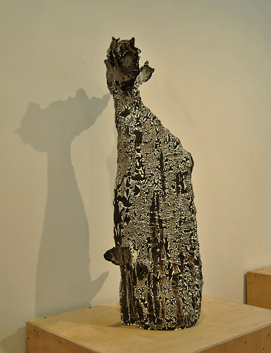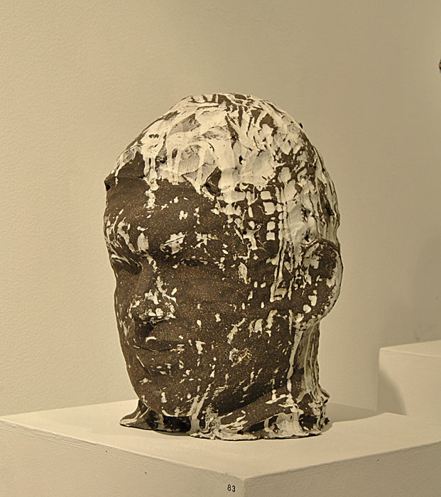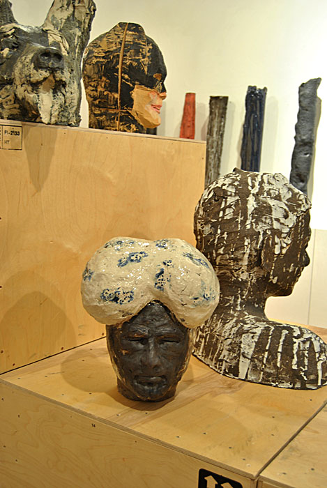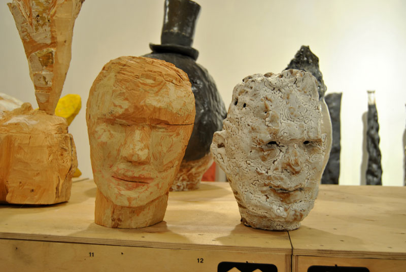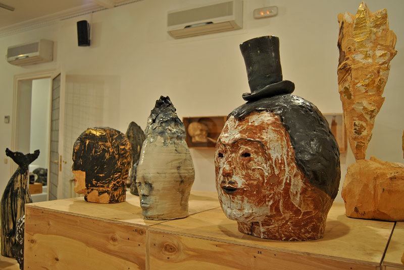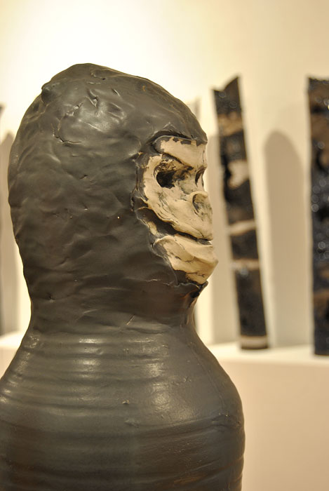 Las cerámicas que podemos ver en esta muestra son totalmente coherentes con esta filosofía, ya que el modelado es poderoso, al servicio de la pieza, sin buscar la belleza implícita de una técnica o la habilidad, como ocurre a menudo en la escultura cerámica. El título de la exposición es “Lucha de arcilla”, y hace referencia a la lucha artística que el creador a tenido que entablar para poder expresarse con un material que era nuevo para él. Cuando se utiliza un nuevo material puede ser normal intentar adaptarlo a tus anteriores procesos de trabajo y la cerámica es evidentemente perfecta para ello, dada su versatilidad como material. La obra de esta muestra podríamos decir que explora tres caminos: las esculturas directamente relacionadas con sus cabezas en madera, que incluso le lleva a componer piezas combinando ambos materiales, como una gran cabeza de chimpancé. En otras ocasiones, dadas las características del montaje, algunas piezas parecen ser instalaciones conjuntas, de madera junto a cerámica, aunque quizá sen piezas independientes.