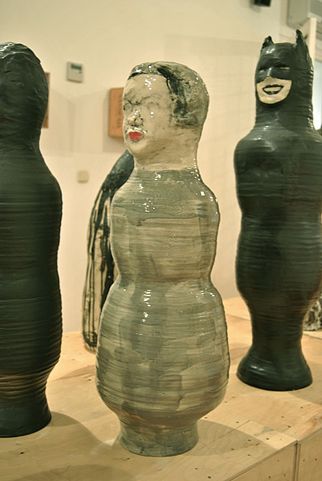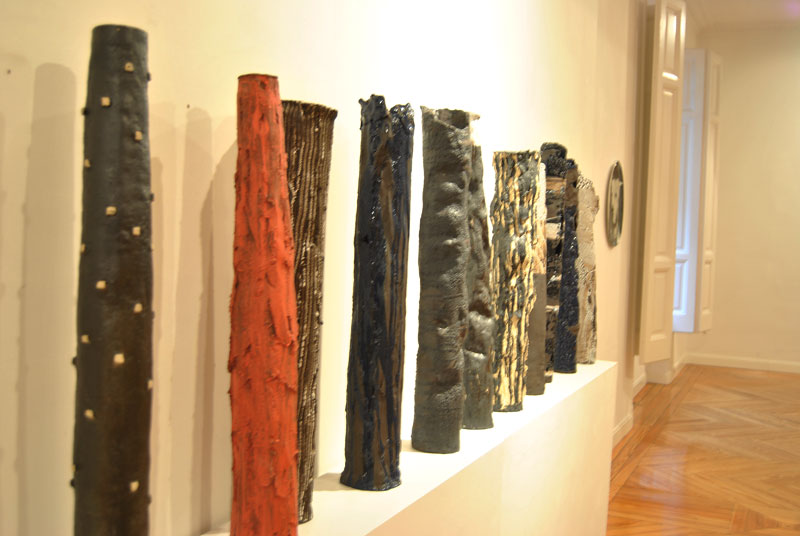 Por último, encontramos una pieza compuesta de varios cilindros, una pieza “muy cerámica”, que podríamos ver en cuanquier exposición de cerámica casi de cualquier parte del mundo, aunque aunque se echa de menos la fuerza bruta que las demás; esta pieza está realizada con varios tipos de esmaltes y tratamientos superficiales, obviamente aportados por alguien que conoce muy bien el oficio de la cerámica y que ha ofrecido a Katajamäki un “muestrario”.