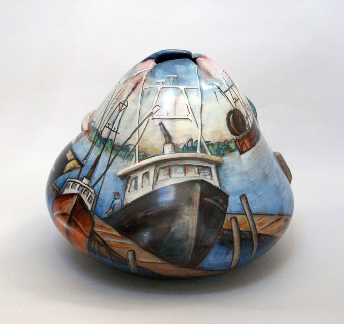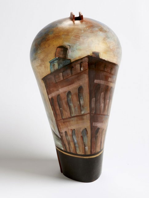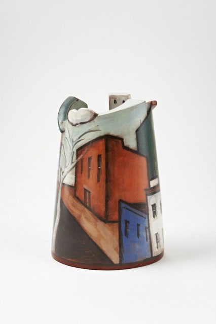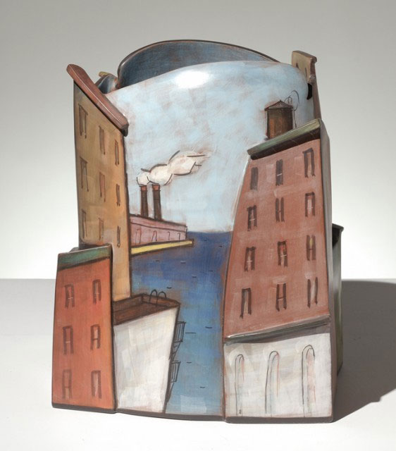 En 1982 estaba en Nueva York visitando a los ceramistas Anne y Jim Walsh. (…) Cuando salía de casa de los Walsh, todavía en la puerta, vi, con el rabillo del ojo, una pila de trapos de la que asomaba la parte superior de una pieza de cerámica con un radiante azul celeste y unas nubes blancas. Pedí verla. Mi primera impresión fue de una mágica unidad: forma, color y material eran todo uno. La imagen del “Downtown Manhattan” rodeaba las sensuales curvas de la pieza y desaparecían y resurgían del volumen de la misma, en un constante desplazamiento cinético hacia adentro y hacia afuera. Tenía además la cualidad de ser al tiempo antigua y contemporánea –una antigua cerámica de un imaginario yacimiento arqueológico de Perú.