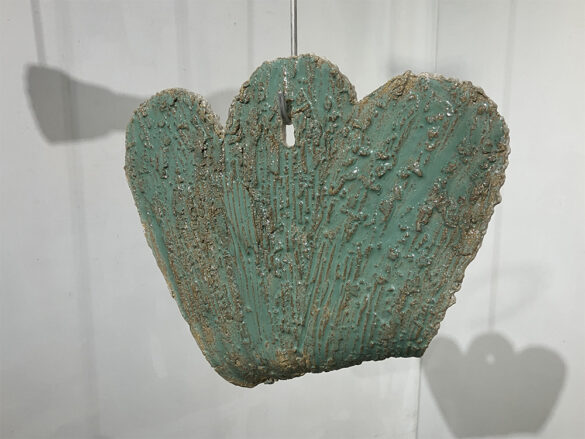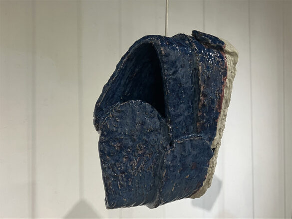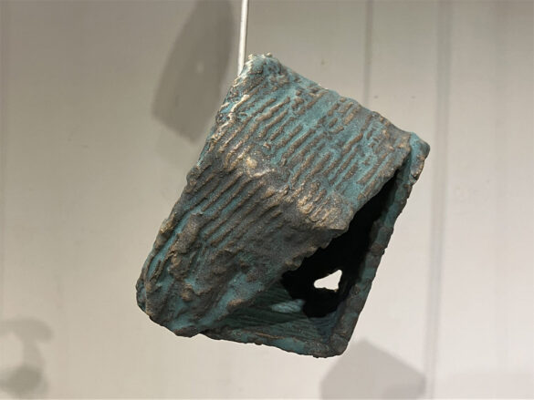 La exposición “Traditions Evolving” incluye a tres artistas que crean objetos visualmente complejos y fascinantes, al tiempo que austeros. Existen diferencias sutiles en el trabajo de cada artista, aunque todos ellos comparten un talento para la moderación. Ashwini Bhat aportó varias pequeñas piezas que atrapan al espectador, demandando su tiempo y atención. La artista contribuyó con dos piezas tituladas Rings of Saturn, grandes lazos sobre dos peanas. En estas formas, Bhat trasciende el equilibrio de dos opuestos: quietud y movimiento, hasta la magnificación mutua de cada elemento. La quietud absoluta de la obra hace que su movimiento parezca más rápido. La calidad cinética innata del trabajo aumenta su quietud. El artista también incluye tres piezas de la serie “One Over Two”, en estas impresionantes obras, Bhat se distancia de la cerámica, excepto de su propia belleza, única y trascendente. Antra Sinha utiliza formas muy sencillas, que parecen dos cabezas de hacha colocadas en ángulos de noventa grados para crear atractivas formas tituladas Tectrarc. Estas formas están compuestas por seis planos curvos. La cocción de leña hace que se expresen las marcas de la ceniza y la reducción. Adil Writer presentó en la exposición Navagraha-nine treasure boxes, un conjunto de nueve cubos pequeños de cerámica, dispuestos en un cuadrado. Bhat, Sinha y Writer generan un interés visual exponencial a la cantidad de detalles que ponen en su trabajo.
