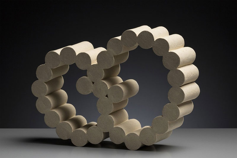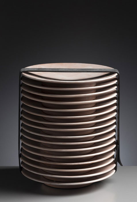 Esta es la actitud de Elena Comeiro (Silleda, Pontevedra, 1932). Anectoda tras anécdota en conversaciones trufadas de nombres como Artigas, Oteiza, Celaya…, se adivina un nexo común en ellas, un modo de intuir y de descubrir. “Me interesa más lo que no se ve que lo que se ve”, su primer auto aprendizaje fue en la Escuela de Nacional de Cerámica de Buenos Aires, donde las largas horas de práctica en el torno le hicieron descubrir en el interior de sus propias piezas, como reacción a la perfección que se le imponía, texturas, huellas y surcos que, olvidados del perfeccionismo, conseguían más emoción que el exterior. Ese juego del surco, de la pieza abierta, desgarrada, le acompañará en su obra a lo largo del tiempo. En ocasiones con forma circular, pero en otros momentos ese descubrimiento interior es llevado a cabo con ladrillos de construcción frescos mostrando otra lectura o con elementos industriales.