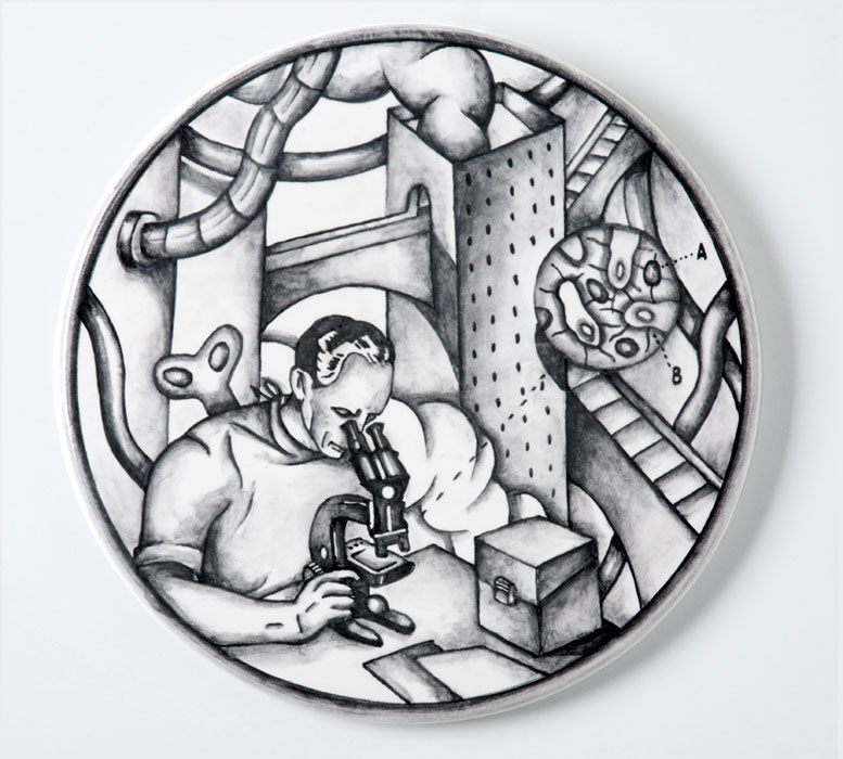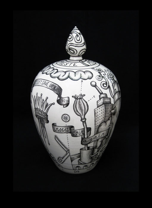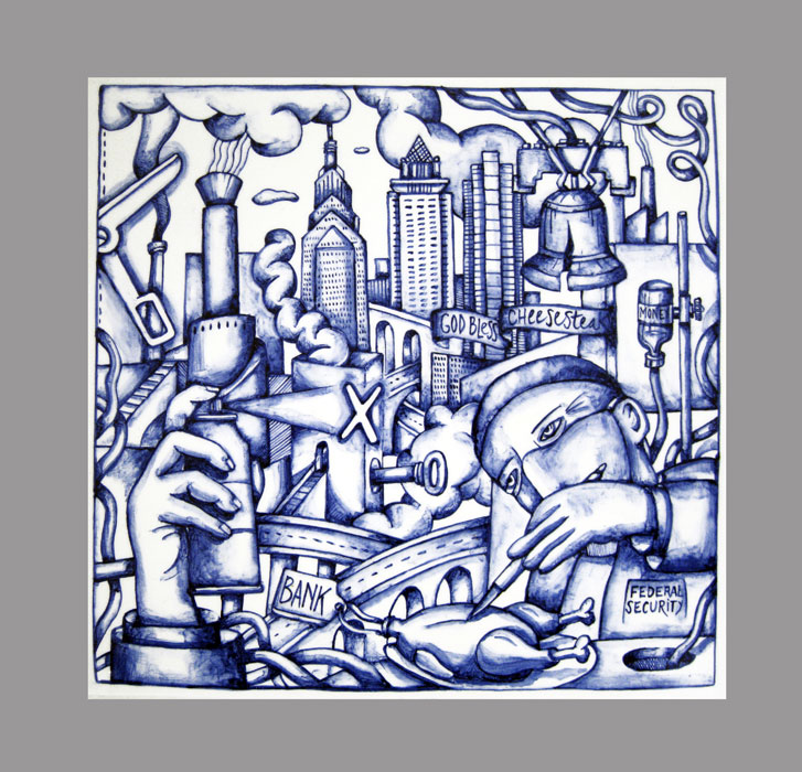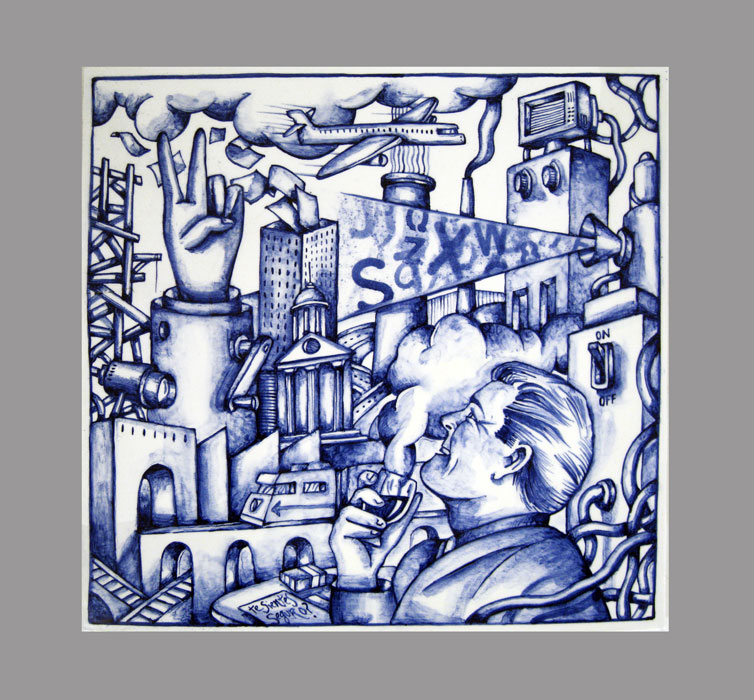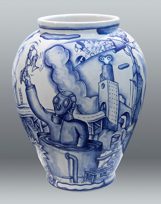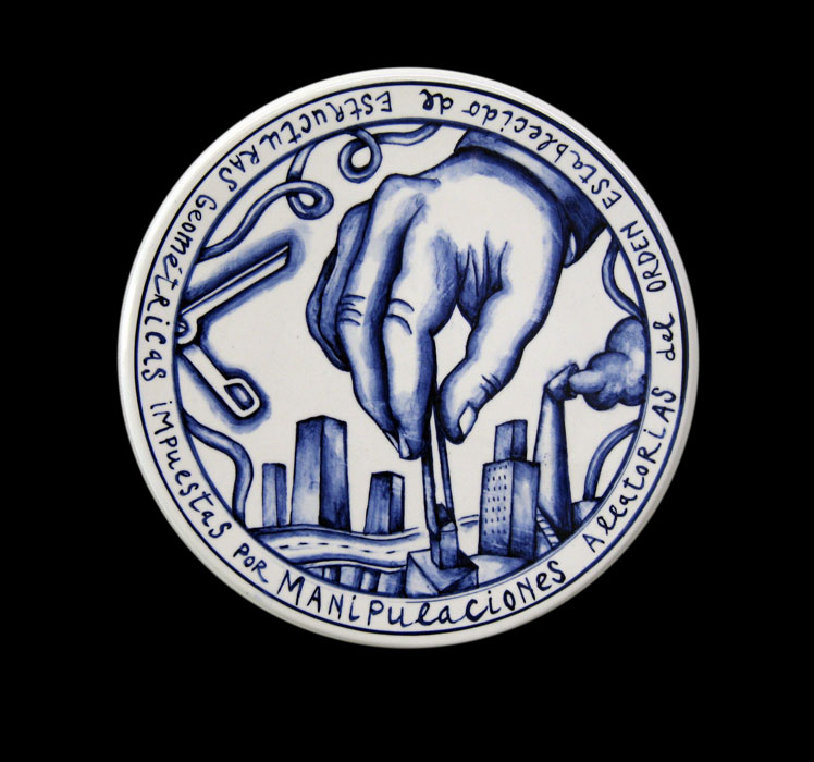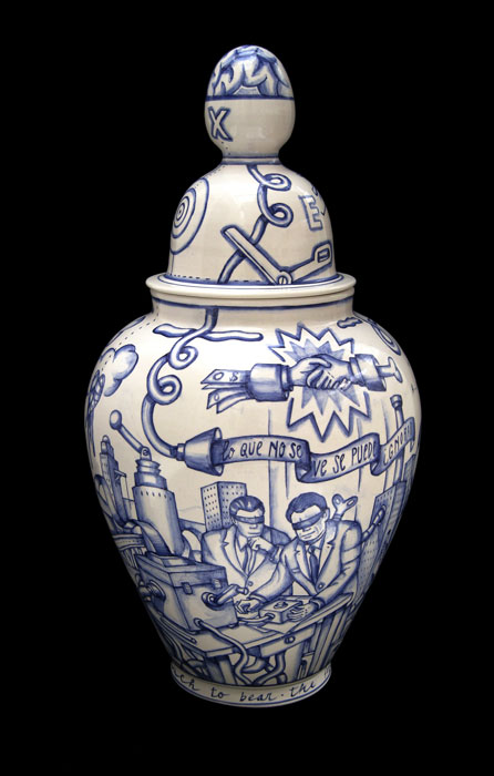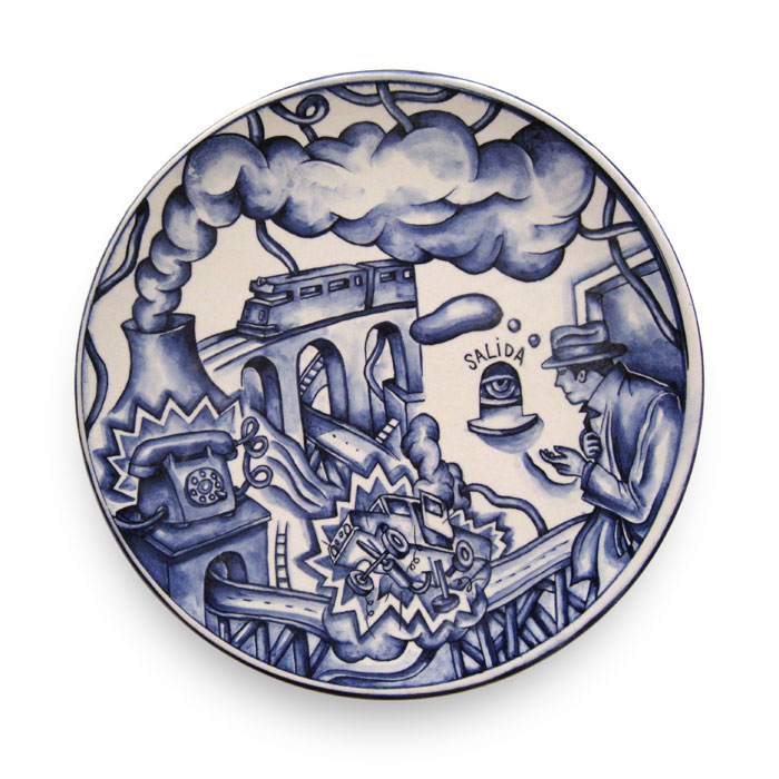 Este artículo, corto pero intenso (como un puñetazo más que como un orgasmo), nos pone frente a una obra que tiene en la paradoja una de sus señas de identidad. Xavier Monsalvatje hace uso de la tradición cerámica de pintura azul sobre blanco, tradicionalmente utilizada para la decoración de cerámica, en ocasiones destinada a las élites, para hacernos reflexionar sobre elmundo en el que vivimo, y que construimos día a día con nuestra indiferencia. En la pintura de Monsalvatje encontramos referencias estilísticas al cómic, el cine (Metrópolis o Blade Runner) o la cultura urbana del graffiti, pero sobre todo una intención de “utilización” del arte como medio de gritar, de contar historias que remuevan el fondo de quien las contempla. Desgraciadamente siempre hay miserias que mostrar; afortunadamente hay artistas como Monsalvatje, que vuelven a la cerámica “funcional”, aunque su función, en este caso, sea la denuncia.