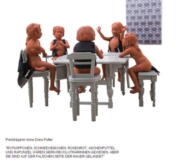 Anne Drew Potter (Estados Unidos), fue premiada con otros 4.000 euros por su grupo escultórico titulado: Rotkäppchen, Schneeweißchen, Rosenrot, Aschenputtel und Rapunzel wären gerne Revolutionärinnen gewesen, aber sie sind auf der falschen Seite der Mauer gelandet (“A Caperucita roja, Blancanieves, Rojaflor, Cenicienta y Rapunzel les habría gustado ser revolucionarios, pero cayeron en el lado equivocado del muro”).