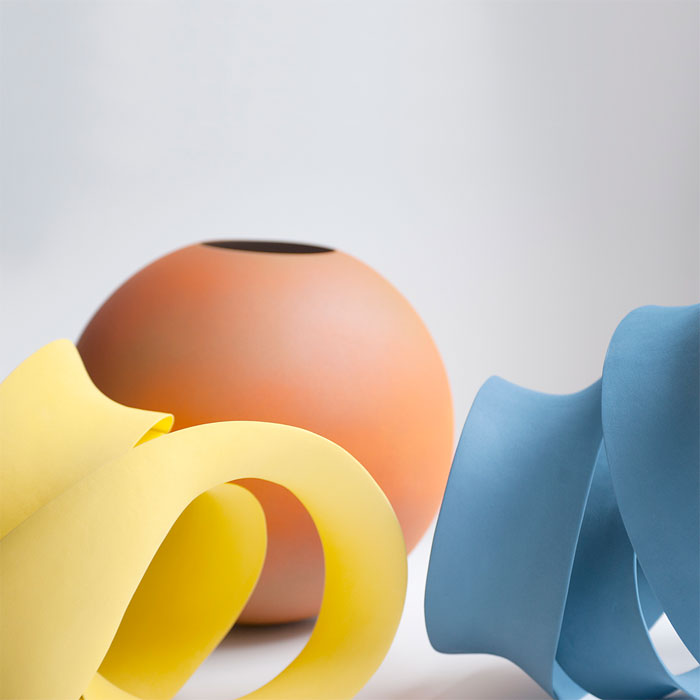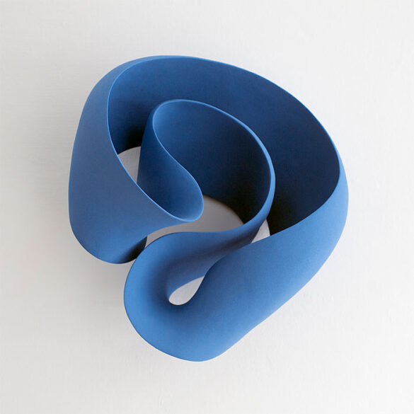 Merete Rasmussen es una ceramista danesa que ha estudiado y residido en varios paises y actualmente desarrolla su carrera artística en Reino Unido. Su trabajo se interna en el terreno del movimiento, la forma y el color. Es especialmente adepta a las intrincadas formas descritas por el matemático alemán August Möbius (1790-1868): “Estoy intrigada por la idea de una superficie continua, por ejemplo, con uno de los bordes conectados. Trabajo con la idea de una composición en las cuatro dimensiones, buscando equilibrio y la armonía a través de una forma”.