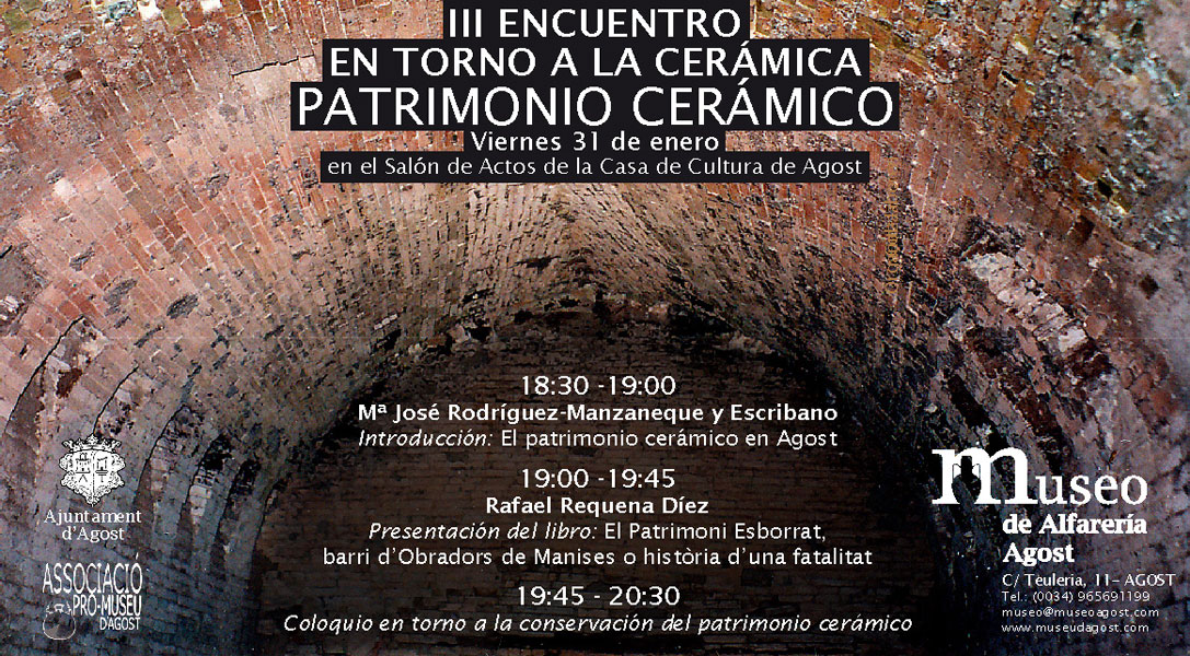 El viernes 31 de enero se clebrará en el Salón de Actos de la Casa de Cultura de Agost el III Encuentro en torno a la cerámica, dedicado al patrimonio cerámico. El programa será el siguiente:
