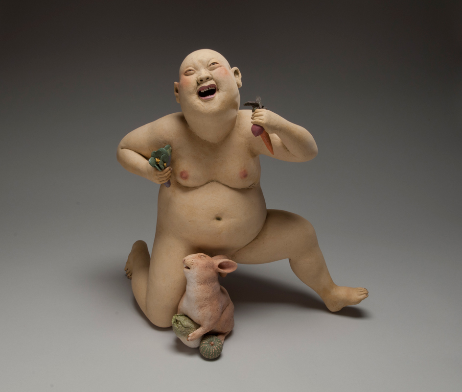 Esther Shimazu cuida el acabado de sus piezas de forma obsesiva, añadiendo ligerísimas capas de color y engobes, puliendo una y otra vez la superficie y retocando hasta los más mínimos detalles. Consigue de esta forma unas figuras humanas y de animales, en ocasiones juntas, que muestran la alegría de la vida sin esconder las complejidades. Sus figuras reflejan sus raíces.