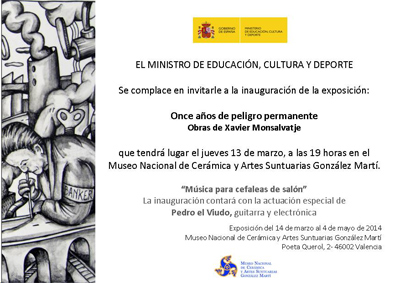 El jueves, 13 de marzo, a las 19 horas, tendrá lugar la inauguración de la exposición “Once años de peligro permanente. Obras de Xavier Monsalvatje”, que se podrá visitar hasta el 4 de mayo.