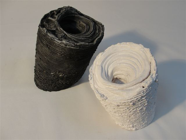“Con mi propuesta hago referencia al momento en que estamos viviendo, tanto en la vertiente social como política y económica. Un momento en que las cosas van muy rápidas y, al mismo tiempo, bastante descontroladas (hoy tengo un piso y mañana me desahucian, dispongo de unos ahorros y las preferentes se los comen, ayer vivía como si el trabajo fuera para siempre y hoy estoy en paro, conquistas sociales que parecían intocables y vemos cómo se desvanecen…, y podríamos ir alargando la lista). Es esta rapidez y descontrol la que me hace utilizar el término “Turbulencias”, el blanco y negro se añade porque cada vez mas parece que desaparecen los grises o términos intermedios. La misma fuerza centrífuga del movimiento nos empuja hacia los extremos (nos coloca fuera del ” sistema”, nos hace independentistas o españolistas, o estás conmigo o contra mí…)”. Las piezas que presento van aparejadas, una en blanco y la otra en negro, sin nada de color.
