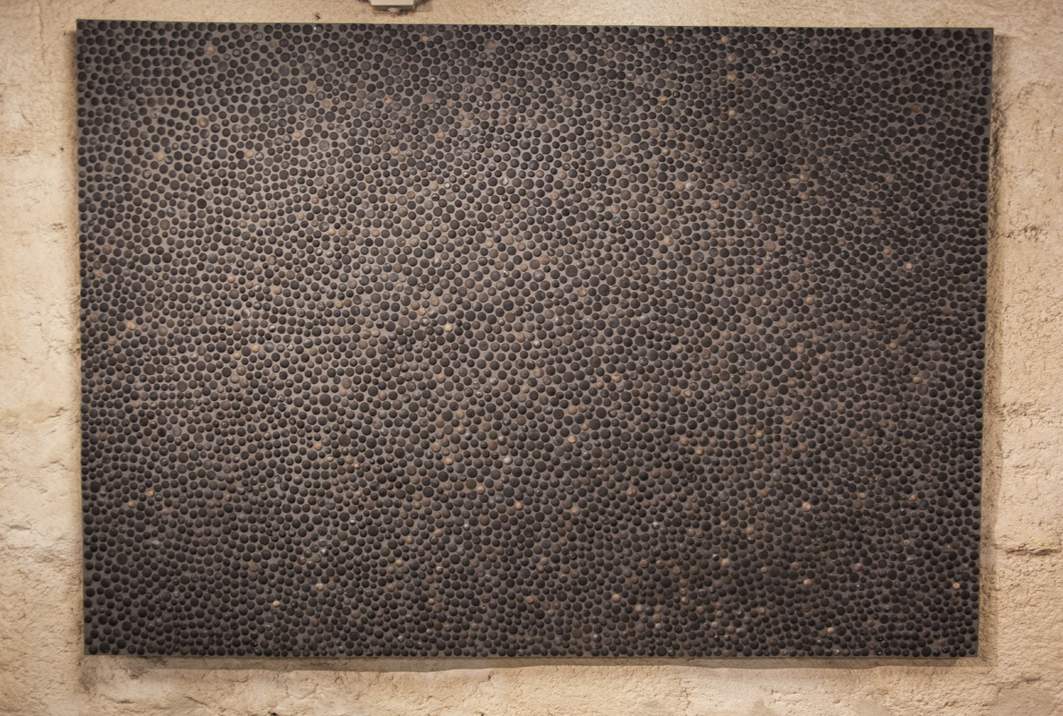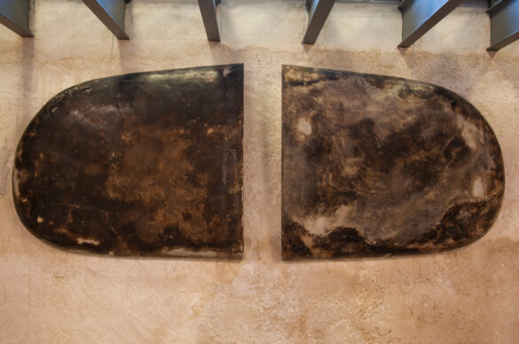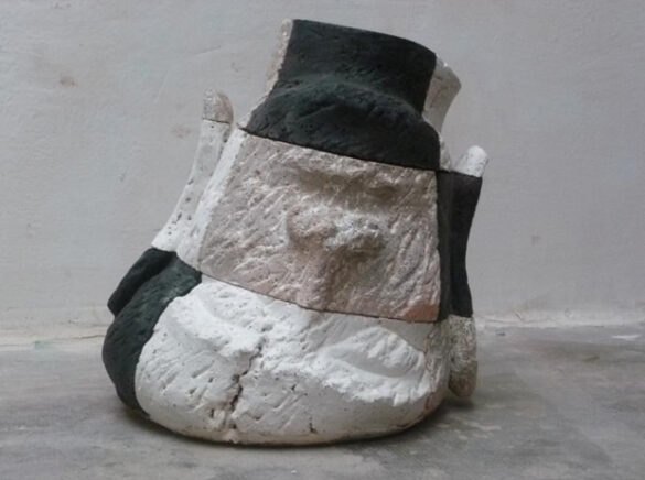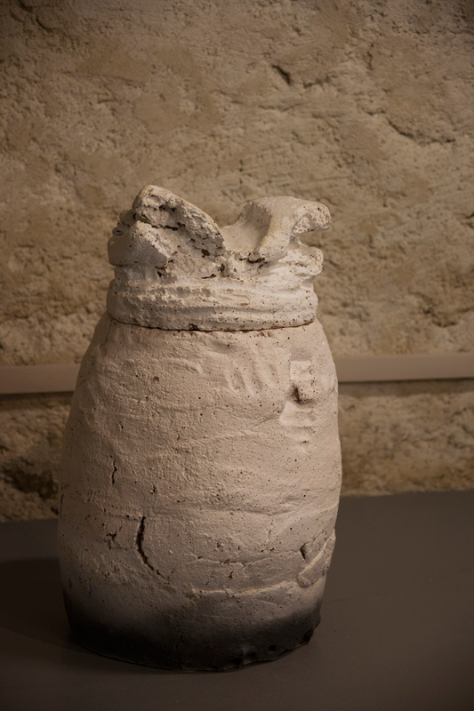 La muestra tiene el título de “Primary”, y ciertamente son, en el mejor de los sentidos, “primarias” las sensaciones que nos provoca la obra de Eukeni al contemplarlas por vez primera. Nos atraen sin saber muy bien por qué. Sin embargo, es esta una sensación breve, ya que pronto comenzamos a distinguir las diferentes capas o estratos que muestra su trabajo: por un lado la superficie, lo visible, que nos atrae por la fuerza de sus texturas, juegos de diferentes tipos de pastas cerámicas, rasgos característicos de la cocción; también las poderosas formas en combinación con la escala de las piezas, como es el caso de la pieza blanca de carácter, al menos conceptualmente, “funcional”: un bote con tapa de 70 cm de alto.