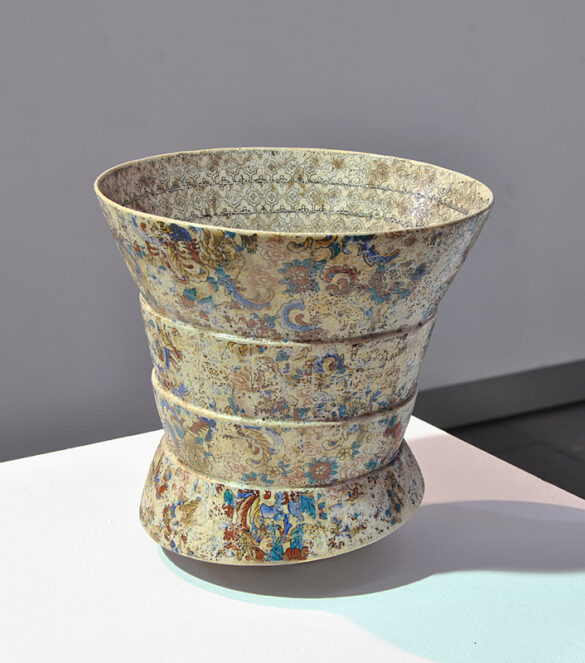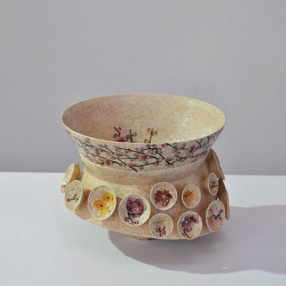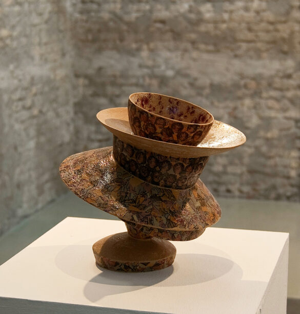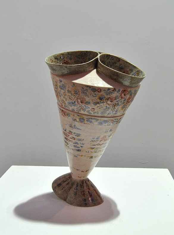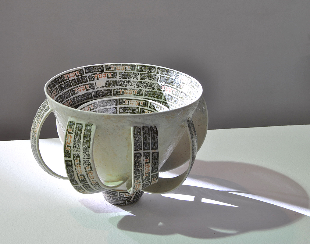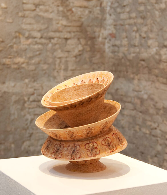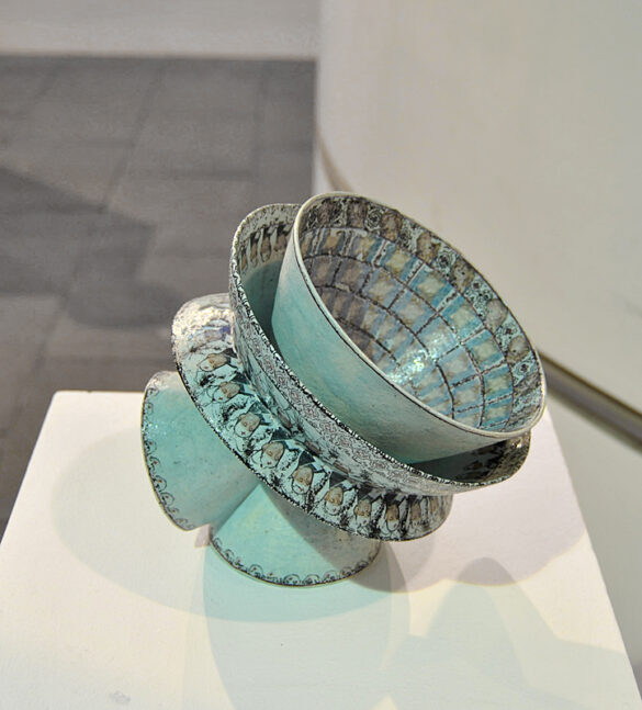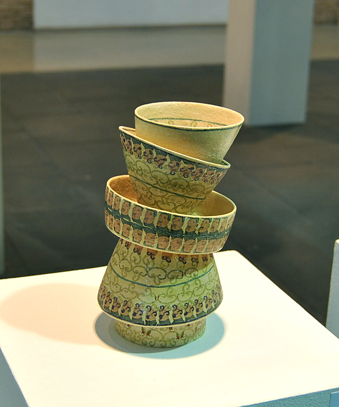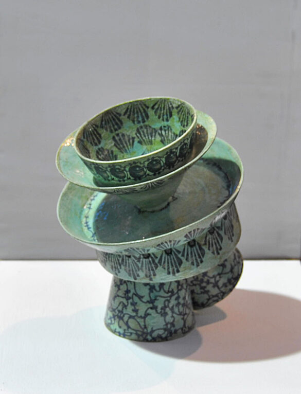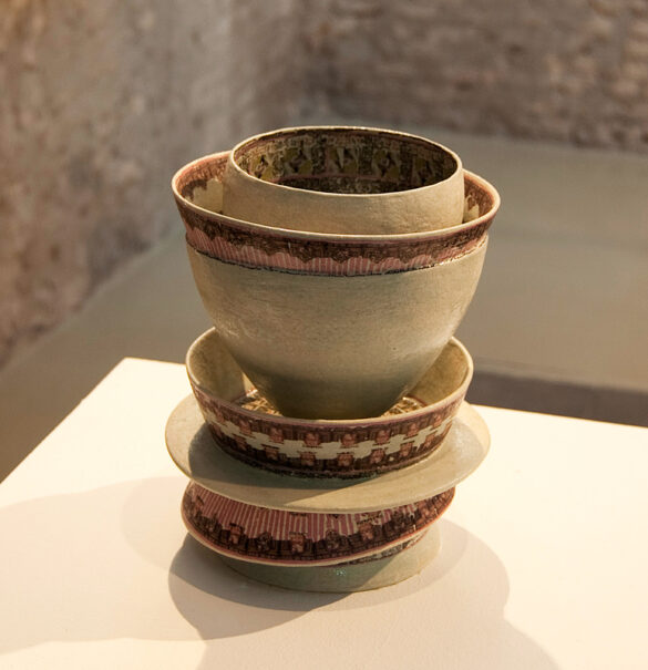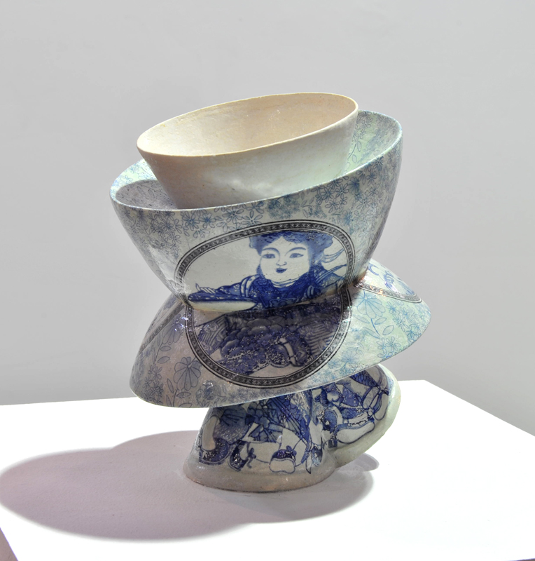 Kris Campo fue premiada en la edición de 2012 de CERCO por su obra “Histriones Blue”. Tanto en la pieza premiada como en las que componen esta muestra, Kris Campo continúa con el juego de las apariencias. Son piezas que resaltan orgullosas su pertenencia a la categoría de “cerámica al torno”, aunque en realidad son pequeñas instalaciones de múltiples piezas superpuestas; las formas, en muchos casos son platos y cuencos, eminentemente funcionales, pero la obra final es escultórica. Por otro lado integra imágenes en las piezas utilizando el mismo juego de contrastes: son referencias a la cerámica histórica, tanto oriental como occidental, pero aquí las imágenes se presentan fragmentadas, integradas de tal forma en la escultura que pierden su origen decorativo.