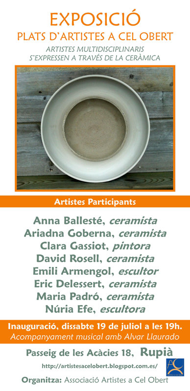 El próximo sábado, 19 de julio, a las 19 horas, se inaugura en la sede de la Associació Artistes a Cel Obert, de Rupià (Girona), la exposición “Plats d’Artistes a Cel Obert” en la que se muestra la obra en cerámica de ocho artistas.
