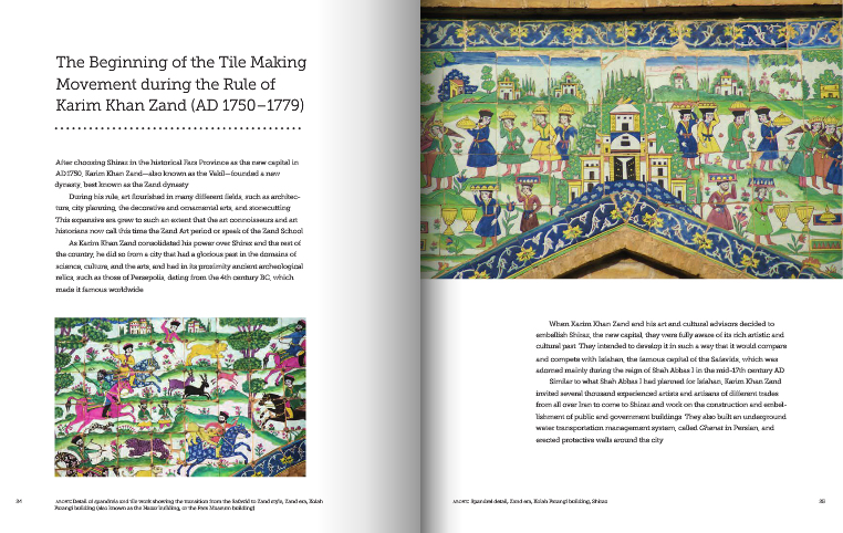 Este libro está dedicado a la denominada “Escuela Shiraz”, en referencia a la tradición de pintura sobre azulejos tradicional de esta ciudad persa, en la que la decoración arquitectónica con azulejería floreció entre los siglos XVIII y XIX, pincipalmente por el estilo de los “siete colores” (“Haft rang”).