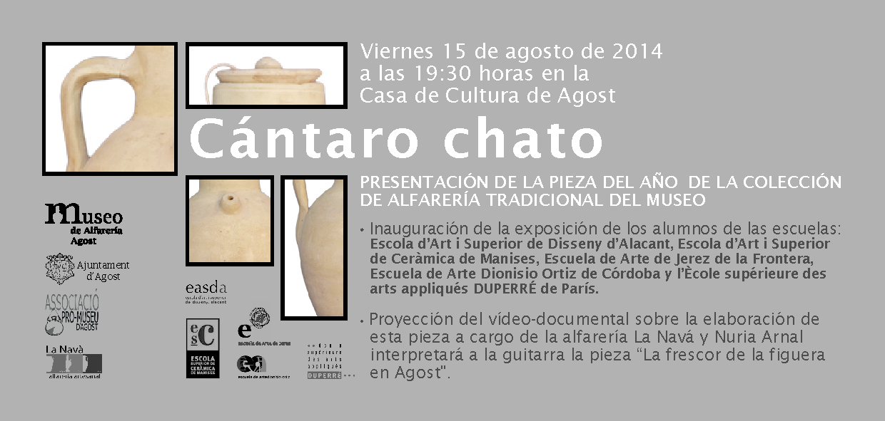 Junto a la presentación de la pieza de este año, que es el llamado “Cántaro chato”, se inaugurará la exposición de cerámica realizada por los alumnos de las escuelas “Escola d’Art i Superior de Disseny d’Alacant, Escola d’Art i Superior de Ceràmica de Manises, Escuela de Arte de Jerez de la Frontera, Escuela de Arte Dionisio Ortis de Córdoba y l’Ècole Supérieure des Arts Appliqués Duperré de París.
