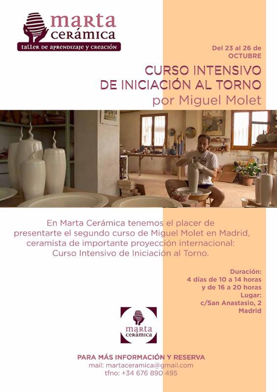 Del 23 al 26 de octubre Miguel Molet ofrecerá un curso intensivo de iniciación al torno en el taller Marta Cerámica, de Madrid.