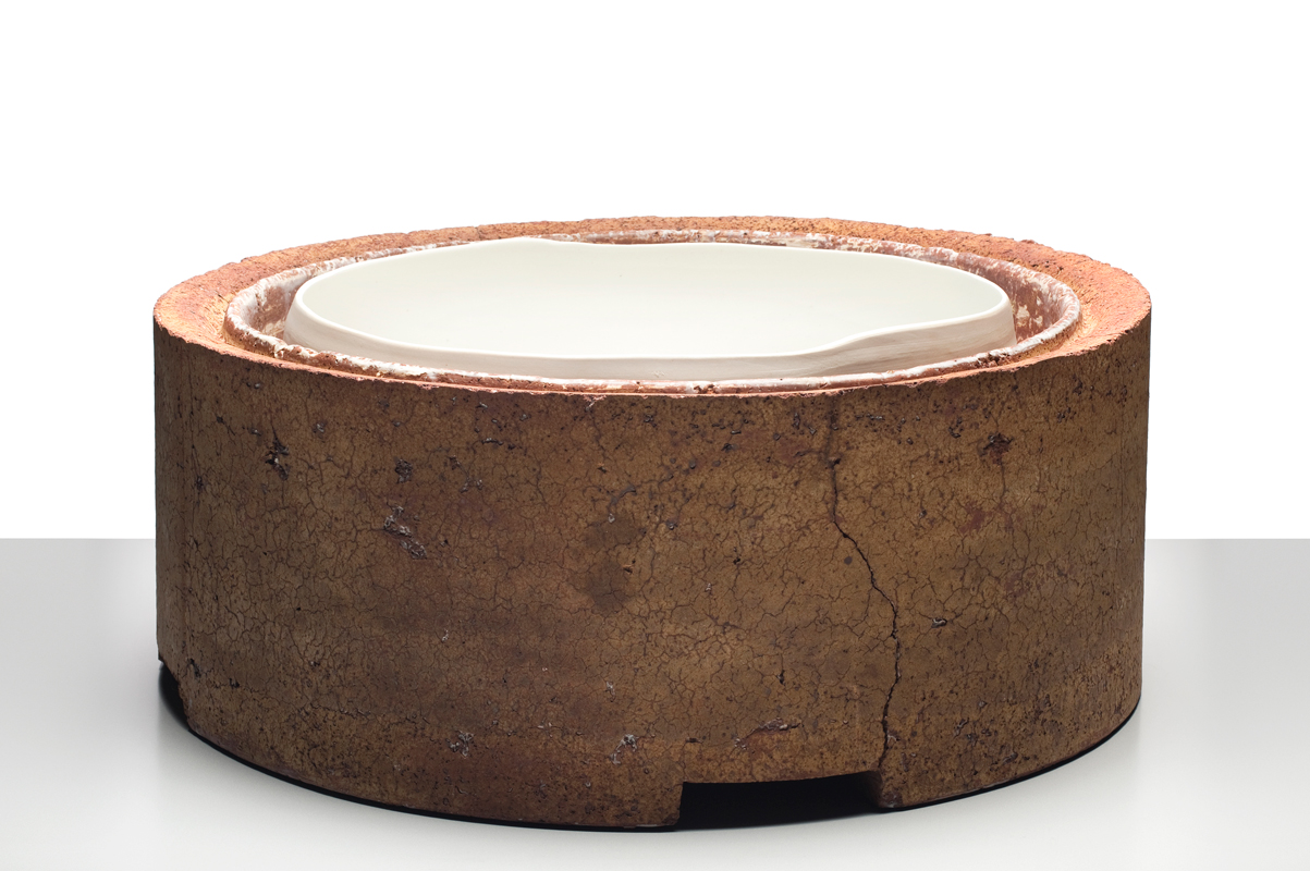 La razón personal de traer esta pieza es la oportunidad que me dio el comisario de esta muestra, Alberto Andrés, de escribir un texto sobre la obra de Josep Madrenas para el catálogo de la exposición, que se puede visitar en el Taller Escuela de Cerámica de Muel (Zaragoza). En esta obra de Madrenas encontramos un desarrollo que va de lo estético, en donde el contraste entre la pieza interior juega con las texturas del recubrimiento de cemento refractario, a lo conceptual, en el que el artista juega con los conceptos tan cerámicos como son el contenedor y el contenido.
