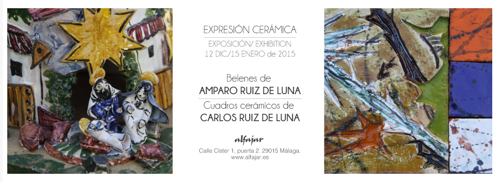 El viernes 12 de diciembre, a las 20,00 horas tendrá lugar la inauguración en la Galería malagueña Alfajar Sala de la exposición “Expresión cerámica”, belenes de Amparo Ruiz De Luna y cuadros cerámicos de Carlos Ruiz De Luna.