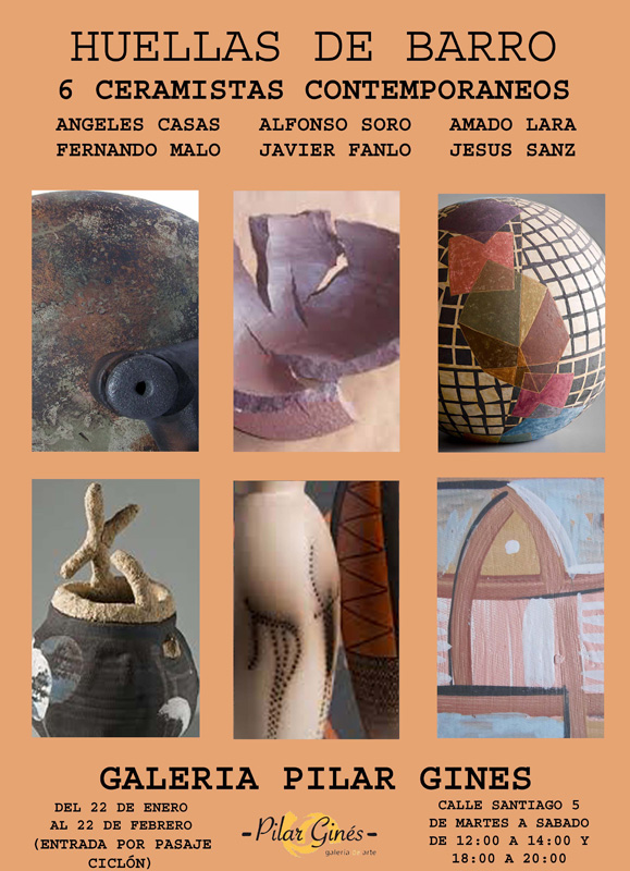 Desde el 22 de enero y hasta el 22 de febrero se puede visitar, en La Galería de Arte Pilar Ginés, de Zaragoza, l ex posición titulada “huellas en el barro, 6 ceramistas contemporáneos, en la que se muestran las obras en cerámica de Angeles Casas, Alfonso Soro, Amado Lara, Fernando Malo, Javier Fanlo y Jesús Sanz.