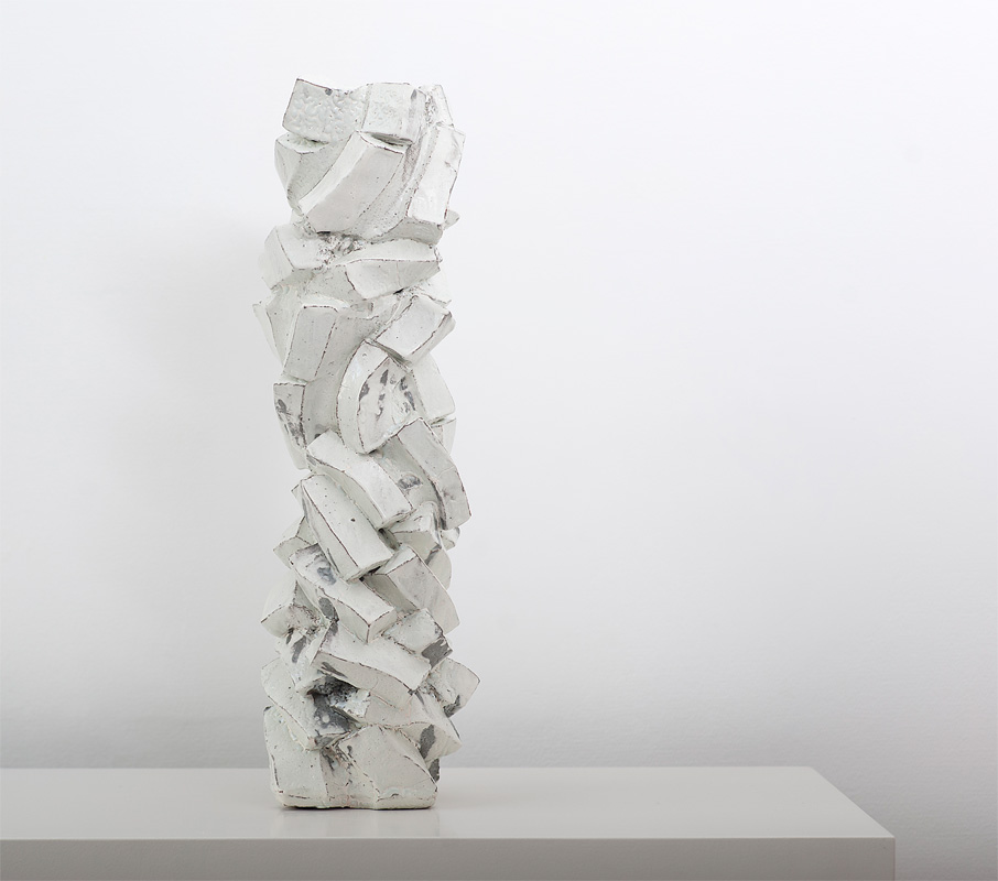 Los visitantes de la galería pueden pensar que están en un museo de historia natural o de biología extraterrestre, pero el trabajo de Zsolt no es ninguna broma. Recién graduado, ya ganó un premio en su primera presentación a la prestigiosa Bienal Internacional de Cerámica de Corea. Su trabajo ha conseguido la aclamación de la crítica, tanto por su ideas, sus exploraciones filosóficas y también por su habilidad técnica, que parecen avanzar en cada nueva exposición. La técnica que emplea Simon es un desarrollo avanzado de los moldes por colada, dejando que la barbotina escape entre las piezas del molde de forma deliberada. Esto le permite crear fascinantes –algunos incluso dirían de otro mundo– efectos entre el interior y el exterior de los objetos. El dominio de las técnicas y del material es tal que ya tiene visualizado el resultado antes de iniciar el proceso; sin embargo, esto no significa que el resultado no le depare sorpresas al abrir el horno.