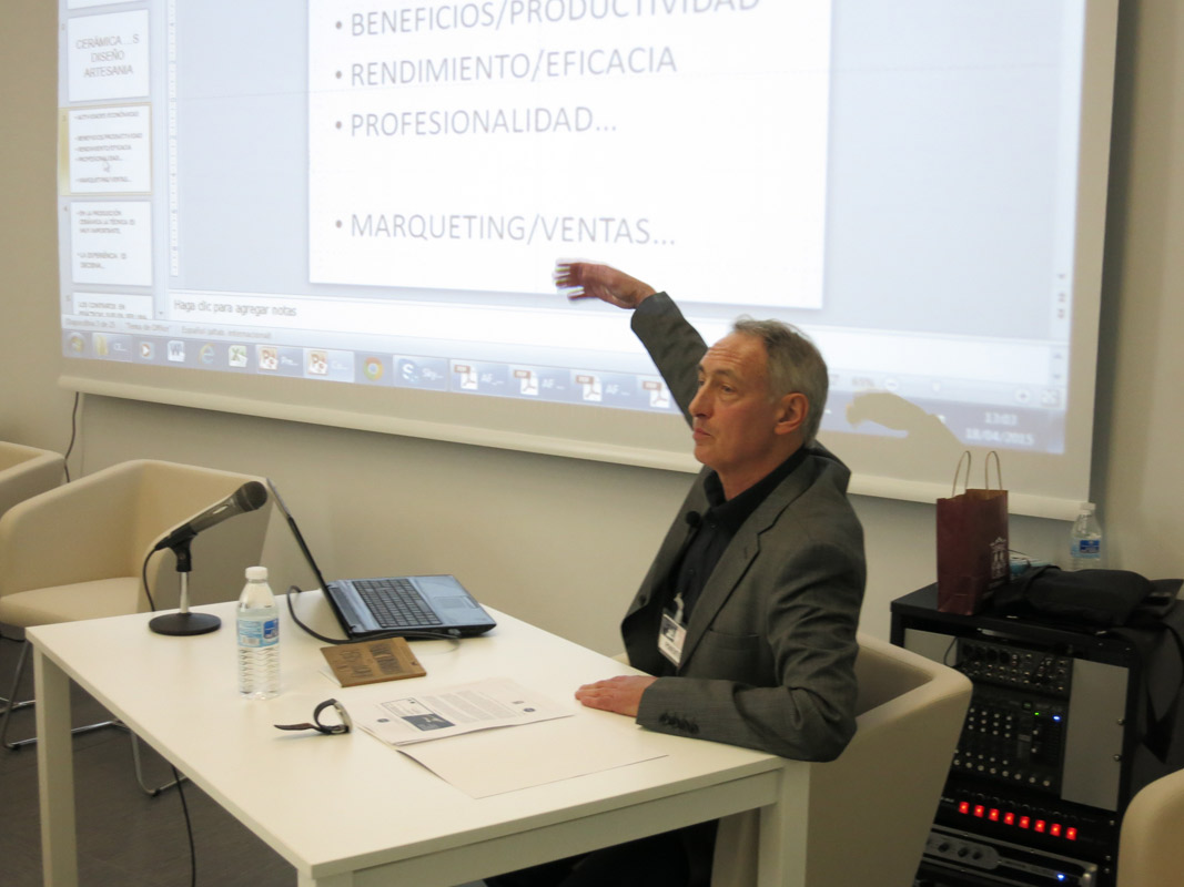 El siguiente en intervenir fue Claudi de José, empresario, profesor y presidente de la asociación Ceramistes de Cataluya, que destacó, basándose en su propia experiencia, la importancia de las prácticas en empresas, así como la necesidad de aclarar que la enseñanza de cerámica no se circunscribe estrictamente al ámbito artístico, sino también del diseño y la industria. habló sin tapujos de la necesidad de crear buenos productos, bien diseñados y comercializados que permitan ofrecer a los estudiantes la perspectiva de un futuro en el que se puedan ganar la vida con la actividad cerámica. En su interesante intervención habló también de la necesidad de habilitar un proceso de “capacitación” para los profesionales reconocidos del sector.