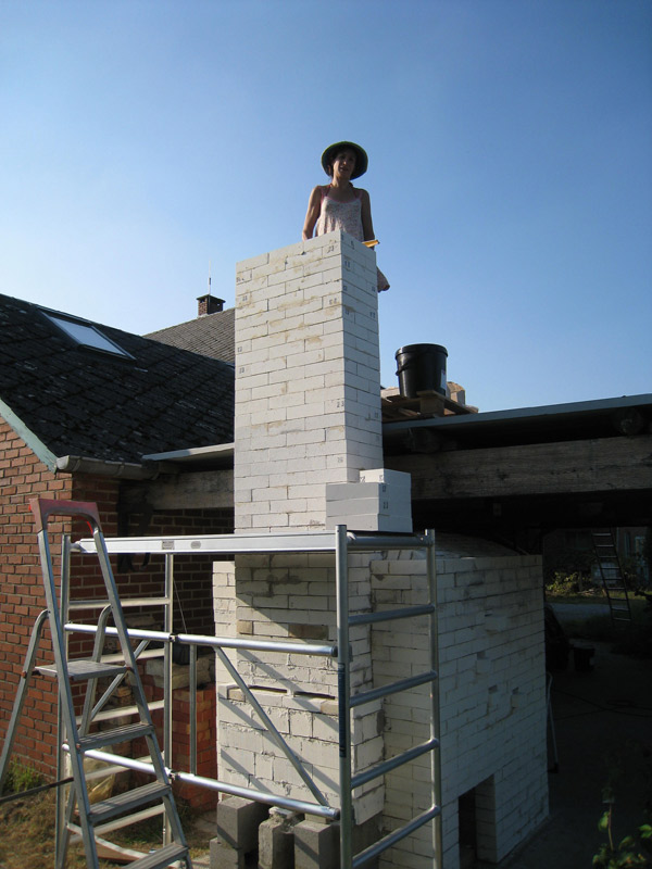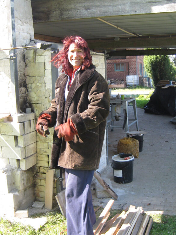 Volví a casa tras aquel curso dándole vueltas a la cabeza sobre cómo encontrar la forma de adaptar el horno que habíamos aprendido a construir para alcanzar temperaturas más altas, por lo menos 1.250 °C, que era lo que a mí me interesaba. La pérdida de calor era importante con ese tipo de construcción así que, a pesar de haber conseguido 1.050 °C sin modificar los planos, necesitaba encontrar soluciones. Una solución podía ser apilar los ladrillos refractarios perpendicularmente para aumentar el ancho de las paredes, pero eso significaba comprar el doble de ladrillos –un costo bastante importante. Había leído un libro de Alain Valtat que explicaba ese método y sabía que podía funcionar. La otra solución que se me ocurrió fue la que finalmente apliqué: simplemente “forré” el horno con ladrillos normales de tierra cocida. La capa de aire entre las dos paredes servía de aislante.