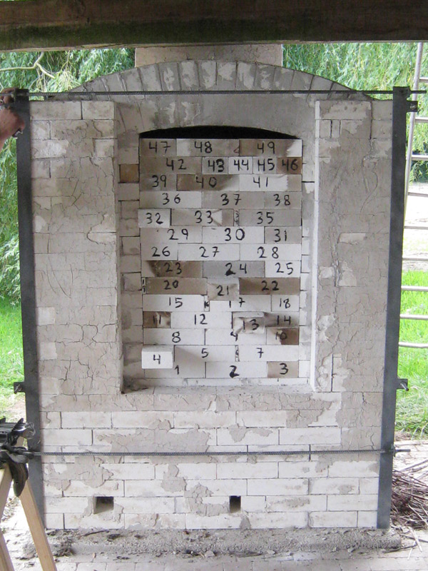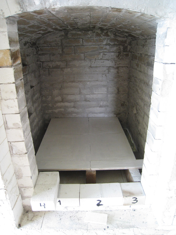 Por fin me decidí por un horno de llama invertida que encontré en un libro de Frederick L. Olsen (The Kiln Book) y en septiembre 2011 empecé la construcción, que duró un mes. Opté por un plano con dos cámaras de combustión cruzadas sobre las cuales se encuentra la cámara de cocción. La bóveda contribuye a distribuir las llamas que se cruzan en el horno, homogeneizando la temperatura. La cámara de cocción tiene una capacidad de poco menos de un metro cúbico y está construida con ladrillos aislantes, mientras que las cámaras de combustión de debajo están hechas con ladrillos refractarios densos, que acumulan el calor.