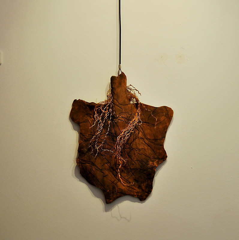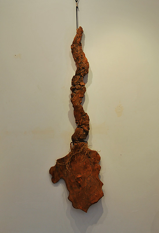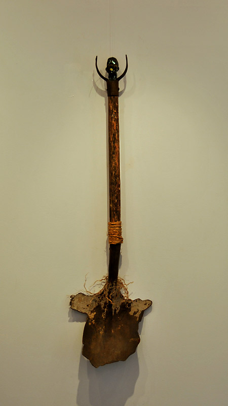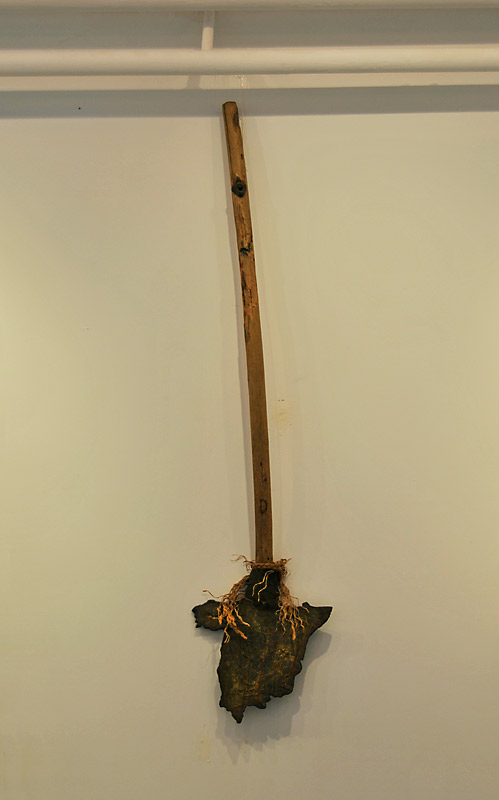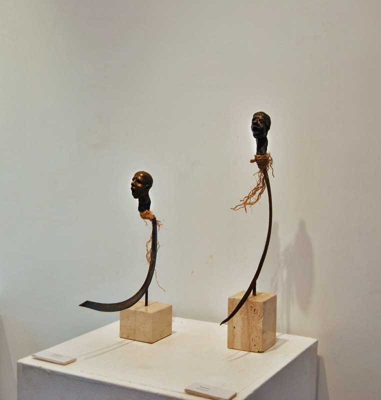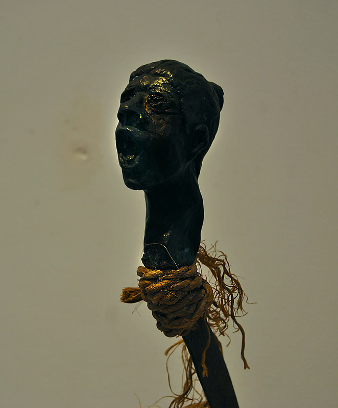Esta es una serie en la que intento es reflejar la sensación que da el bastón en diferentes pueblos, como el gitano, de mando o de prestigio; me apetecía, por otro lado, colocarles una serie de elementos, como clavos que parecen seres humanos, que indican, en cierto modo, esa sensación de poder. Son seres humanos que también buscan esa dicotomía entre arriba y abajo, el poder… Como siempre, mezclo materiales, madera, clavos, cuerda y bronce.