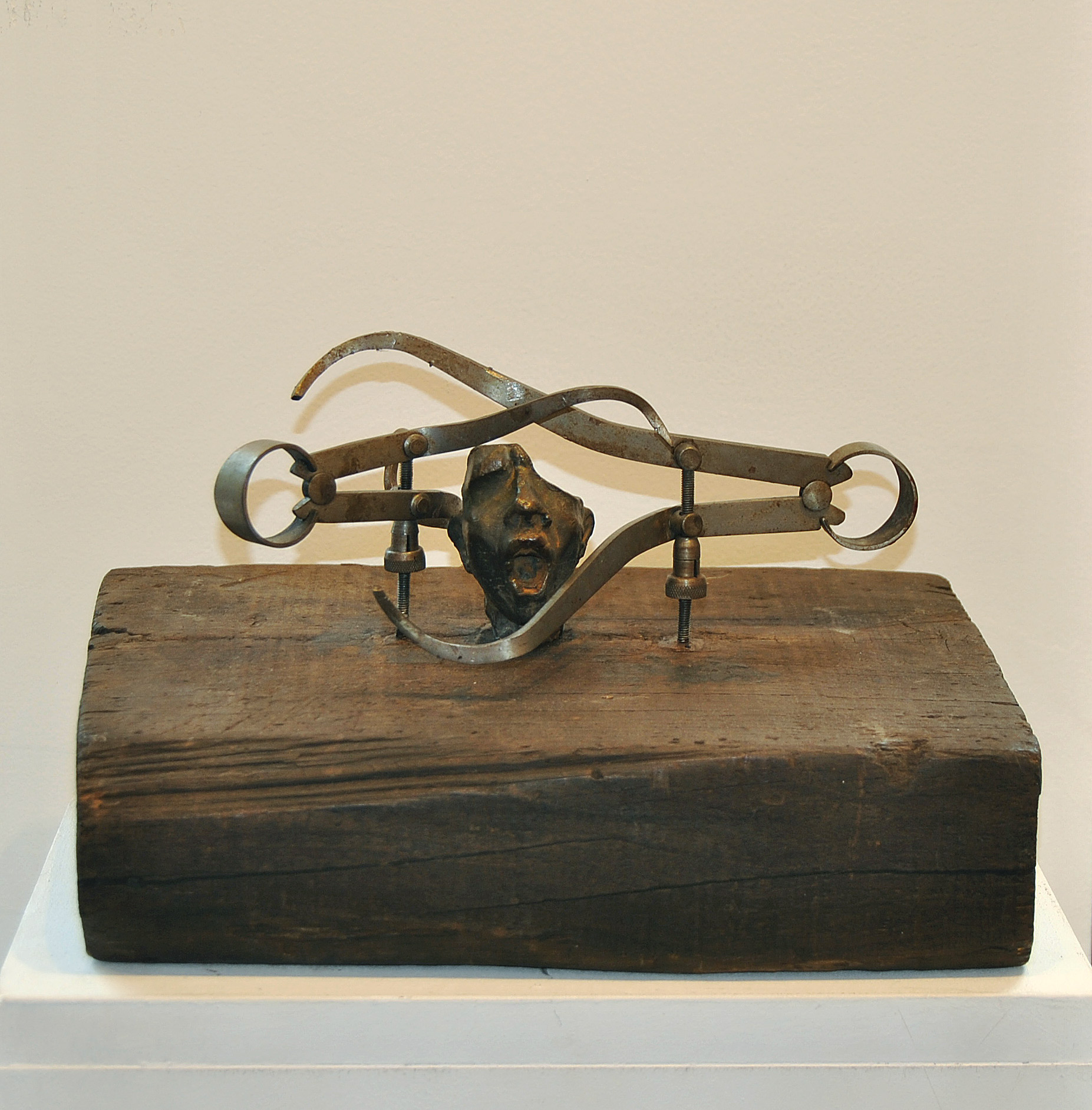 Me gusta mucho que cada persona haga suyas las obras, en ocasiones hay personas que te cuentan cosas que tú no te habías planteado. Esta pieza en concreto es de una serie titulada “Danger trabajo, fortalezas y debilidades”, relacionados con el mundo del trabajo, que comencé antes de la crisis económica, pero que después ha vuelto a tener un significado muy especial. Llegué a hacer una exposición itinerante con 56 obras que tenían algo que ver con lo que nos agobia, lo que nos mata, lo que nos complica. Eduardo Galeano decía algo así como que el trabajo es un vicio que no podemos evitar. En esta pieza lo que vemos son dos compases que atrapan a una figura que lo que quiere es gritar o salir. En muchos casos te puede gustar mucho tu trabajo, pero a la vez sentirte muy atrapado, y quise representar un poco eso. El arte también puede contribuir a cambiar realidades sociales. El arte y la cultura en general.