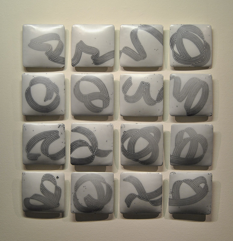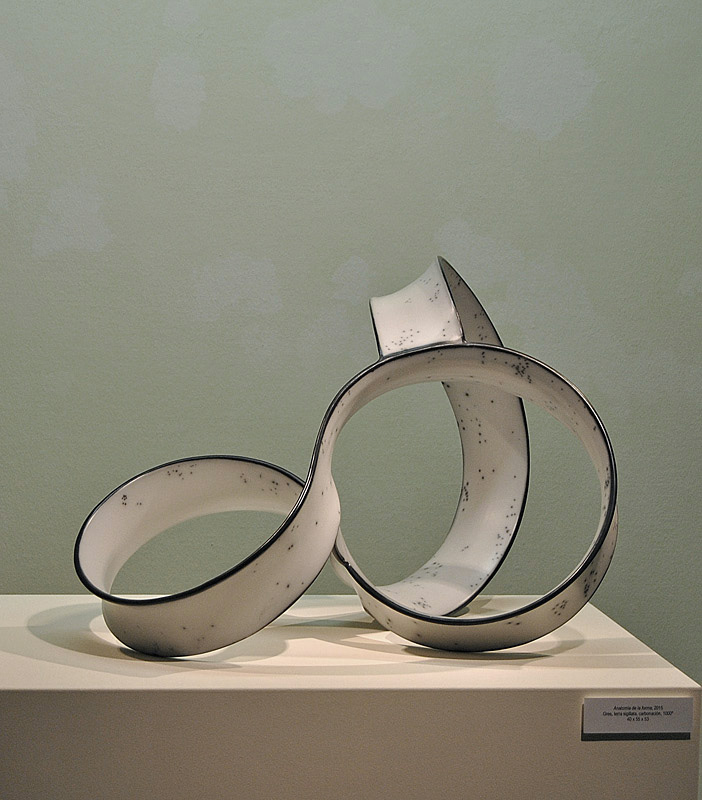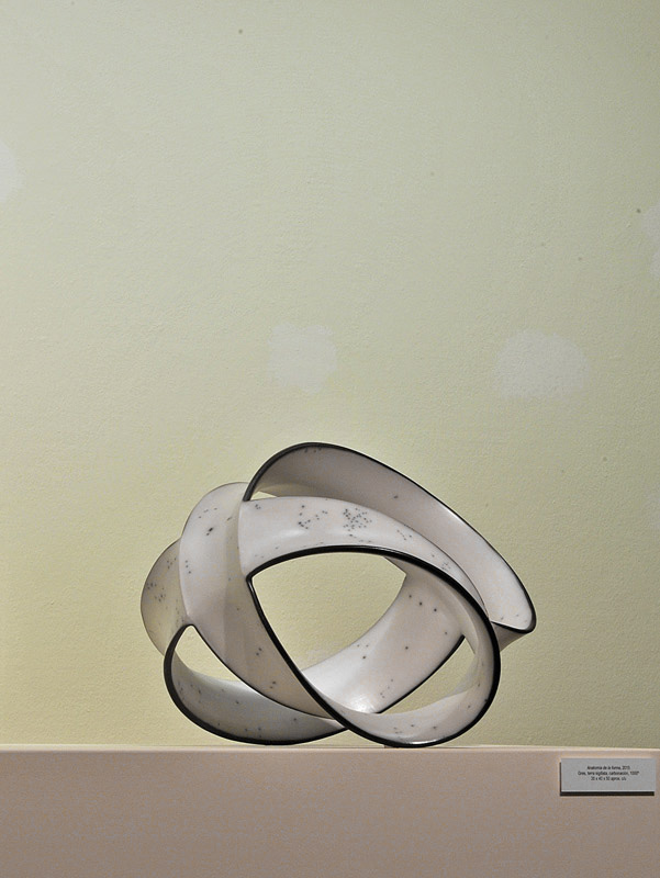 Para esta exposición Molet ha optado por mostrar casi exclusivamente piezas de la serie “Anatomías de la forma”, que se caracteriza por la sobriedad cromática: el blanco de las pastas de gres y el negro de los ahumados, que han sido siempre una de las “marcas de autor” de Miguel Molet. En la técnica pasa a un segundo plano y deja el protagonismo al estudio de las formas, quedando estos acabados ahumados como una forma de tamizar reflejos y luces que podrían distraer del complejo entramado que conforma sus obras.