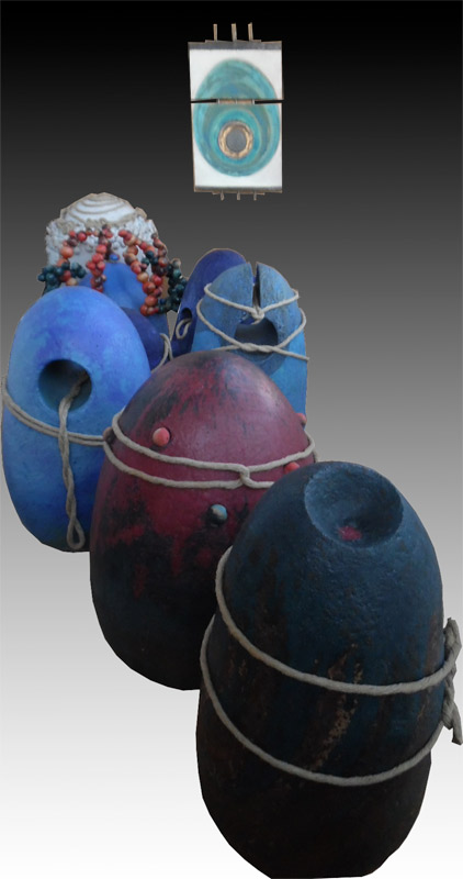Junto a la obra “Éxodo”, que agrupa varias esculturas-huevo realizadas en cerámica, simulando una marcha y una pintura de arena y óleo sobre lienzo, completando el tema de la marcha con formas ovoides que representan personas que caminan…