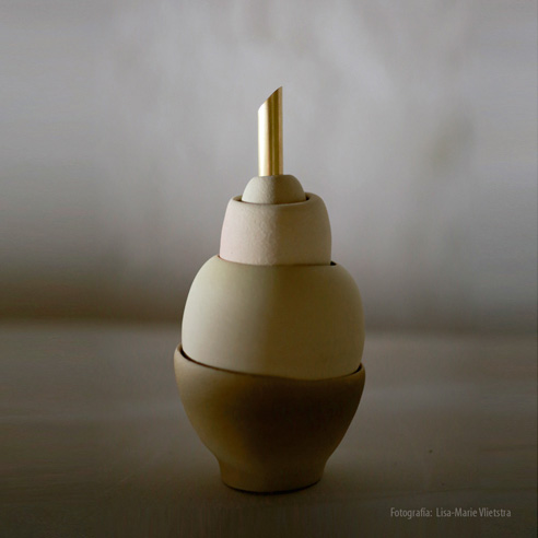 “Estos objetos son frágiles. Parten de la incertidumbre y la duda, carecen de equilibrio y lo suplen con gracia. Estados inestables como elogio a la búsqueda de la Belleza. Los elementos de gres están compuestos por figuras aparentemente inestables, sin embargo consistentes. Cada escultura busca la provocación con su combinación de formas y arreglos. Anillos, cuencos y varillas, con delicados matices y engobes, dandoles ilusión de volumen. Contrastan latón e hilo como nexo de unión de los componentes.”