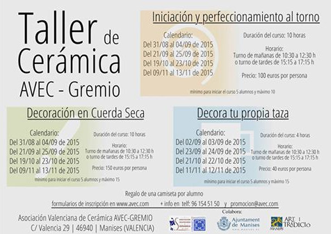 La Asociación Valenciana de Cerámica AVEC-GREMIO organiza diferentes talleres de cerámica que darán comienzo a partir del 31 de agosto 2015. estos cursos se realizarán en el Taller-Escuela de la Asociación Valenciana de Cerámica AVEC-Gremio en turnos de mañana y tarde.