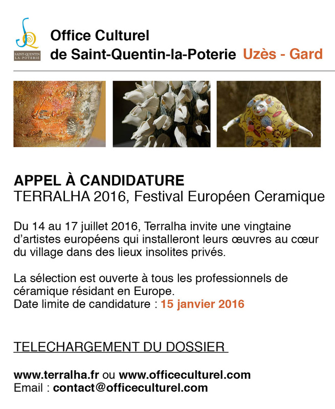 Del 14 al 17 de julio de 2016 se celebrará en St-Quentin-la-Poterie (Francia), una nueva edición de “Terralha”, Festival Europeo de las Artes Cerámicas, que congrega a una veintena de ceramistas que exponen sus obras en diferentes lugares de la localidad.