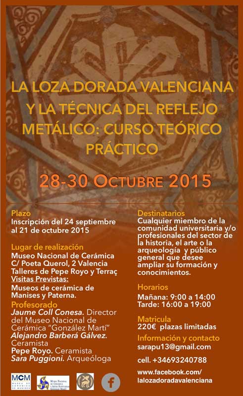 Los próximos 28 al 30 de octubre de 2015 se celebrará en el Museo Nacional de Cerámica “González Martí” este curso teórico práctico que constará de clases prácticas y conferencias y clases teóricas.