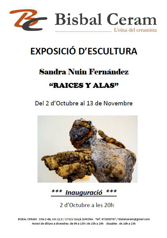 Del 2 de octubre al 13 de noviembre se puede visitar la exposición de escultura, titulada “Raices y Alas”, de Sandra Nui Fernández en la sala de exposiciones de Bisbal Ceram, en Corça (Girona).