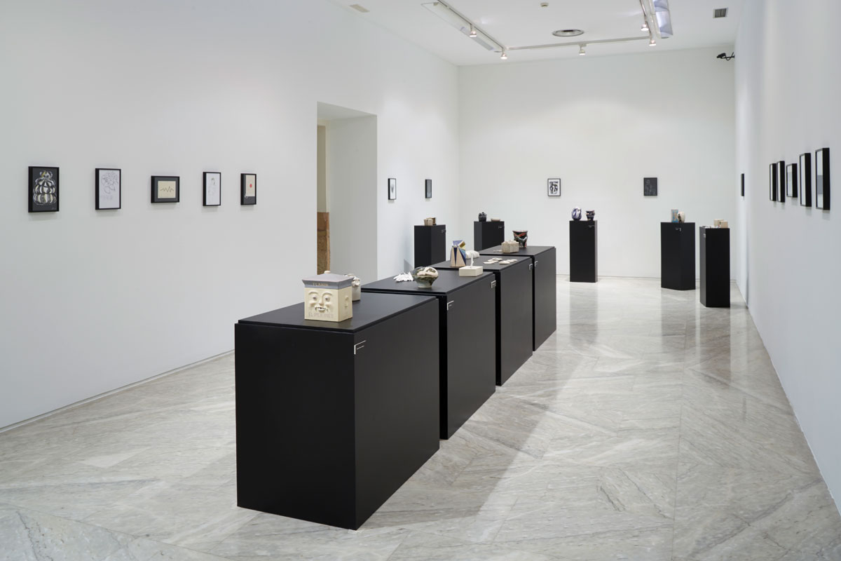 muestra tres piezas cerámicas de pequeño formato y una serie de dibujos, apuntes y bocetos previos al