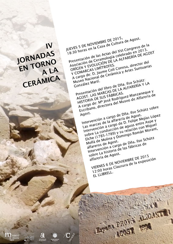 El jueves, 5 y el viernes 6 de noviembre de 2015 se celebran en Agost las IV Jornadas en torno a la Cerámica, que contarán con varias conferencias y charlas en torno a la alfarería y la cerámica histórica