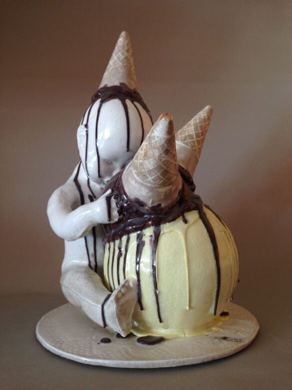 “Cristina Salvans nos transporta en el tiempo para hacernos recordar lo mejor de la vida: donde viven aquellos pequeños placeres. La intención de su obra es la búsqueda de la diversión pretendiendo que sea el espectador que contempla la obra el que más disfrute. Desde el placer aceptado de lo dulce, observado con ternura, nos guía por su trabajo del consumo de lo necesario hasta la inflamación del consumido: Placer y endorfinas. Estrés y ansiedad. La humanización como excusa, la metamorfosis como culpa.”