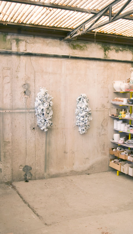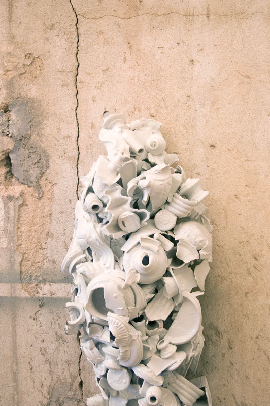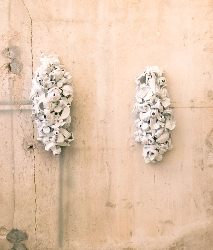 “La búsqueda de Pablo Barreiro actualiza la lectura `benjaminiana´ de la reproductibilidad objetual, una cuestión que se ha mantenido durante el desarrollo del trabajo cerámico. La recuperación de históricos procesos industriales en desuso y su interpretación seriada es el pretexto con el que el artista afronta la experiencia de la residencia, elaborando en su percurso, una rica producción de obras que marcan los ritmos de los procesos productivos: creación modelo-molde-forma-asimilación-desintegración. Le reflexión del artista intenta dar respuesta a la tetralogía cultural de la Copia, proporcionando nuevas interpretaciones dimensionales: asimilaciones escultóricas realizadas en formas y materias diversas; desde la blanca arcilla hasta la porcelana pasando por los refractarios. La técnica y su uso vienen asimilados para desplegar el conflicto entre el original y su copia. El escenario eclesiástico de la pequeña Iglesia de Santa Romana, realiza el ejemplo de la masificación de la iconografia litúrgica mientras el discurrir contínuo de luces y sonidos de la carretera reclaman el maquinario rito serial.”