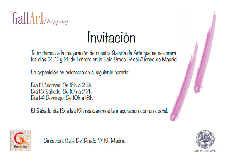 Te invitamos a la inauguración de nuestra Galería de Arte que se celebrará los días 12,13 y 14 de Febrero en la Sala Prado 19 del Ateneo de Madrid.