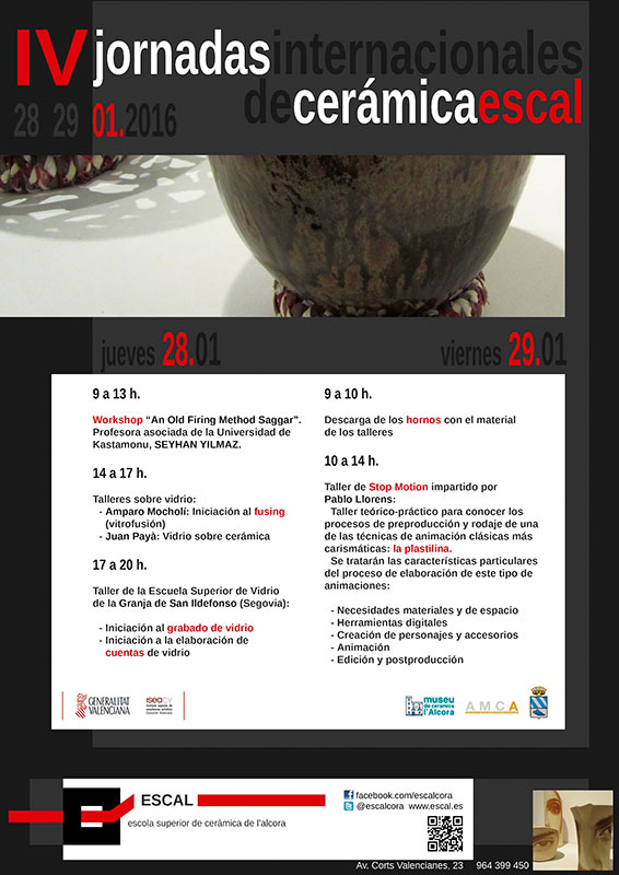 Los días 28 y 29 de enero tendrán lugar las “IV Jornadas Internacionales de Cerámica ESCAL”en la Escola Superior de Ceràmica de l’Alcora (Castellón) durante las cuales se podrá asistir a una cocción de cerámica y talleres de vidrio y Stop Motion