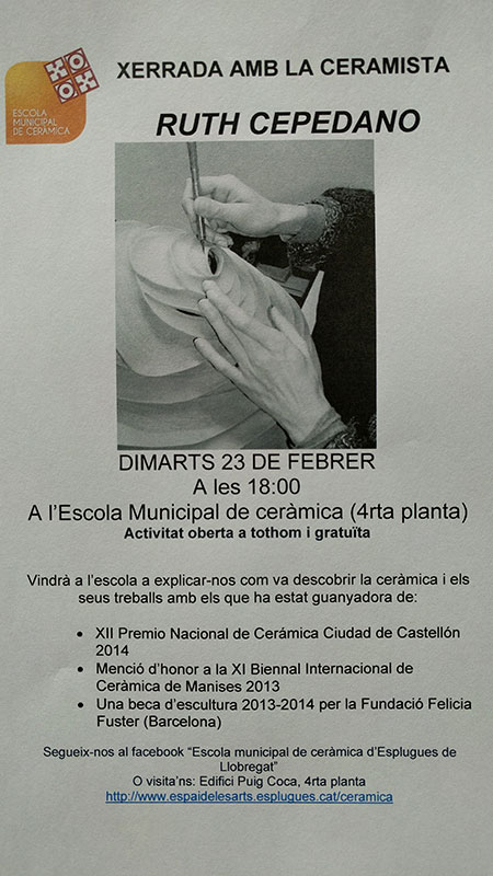 El próximo día 23 de febrero, a las 18 horas, se celebrará en la Escuela Municipal de Cerámica de Esplugues de Llobregat esta jornada, abierta y gratuita, dedicada a la ceramista Ruth Cepedano