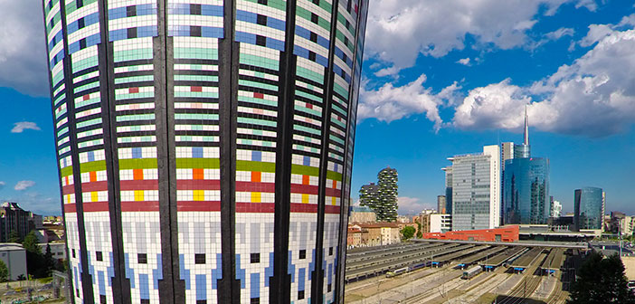 Esta torre data de 1964 y fue en su momento un depósito de agua en los terrenos de la estación de tren de Porta Garibaldi. Para esta renovación se utilizaron más de 100.000 azulejos.